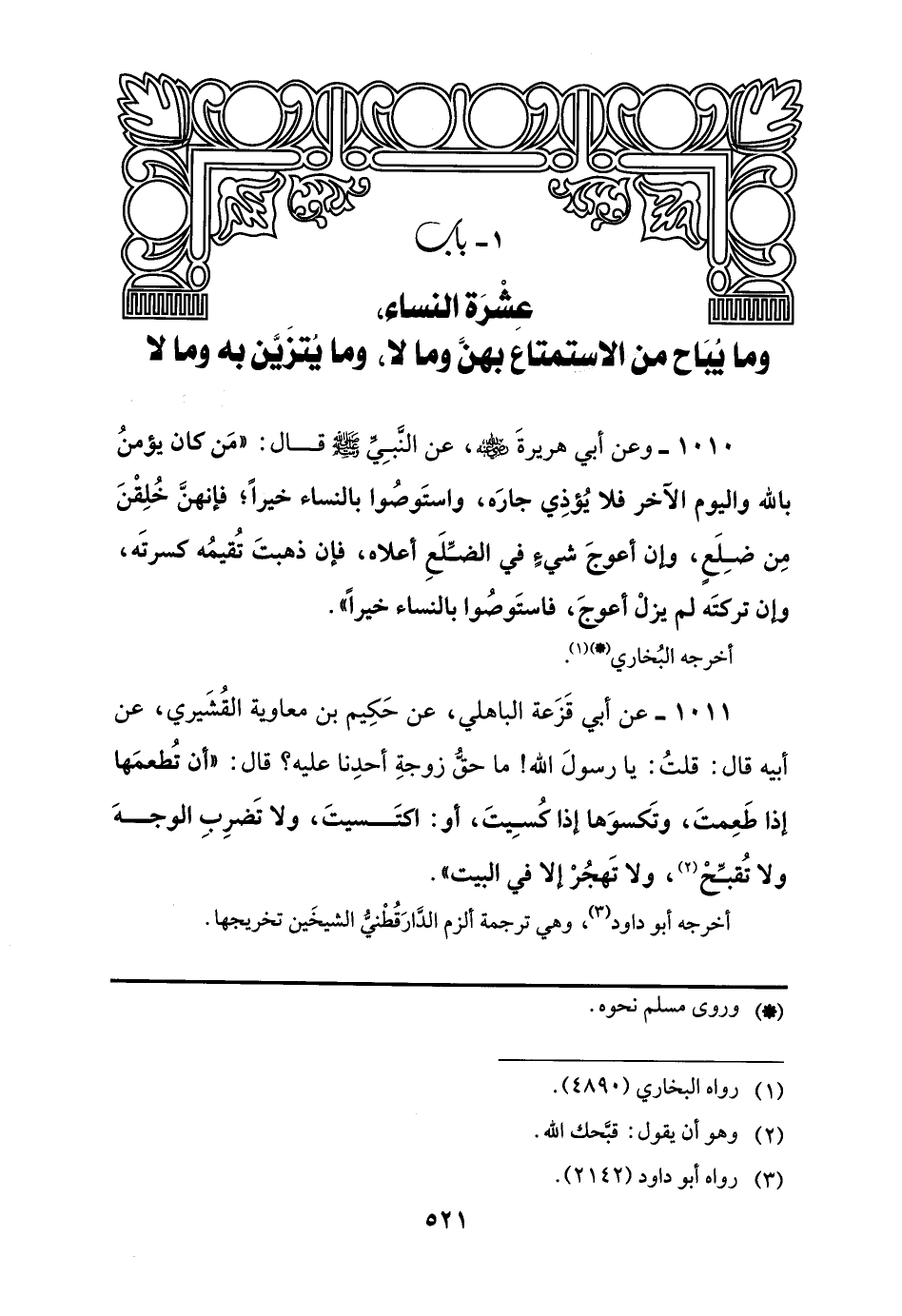 1010 - وعن أبي هريرةَ -رضي اللَّه عنه-، عن النَّبِي -صلى اللَّه عليه وسلم- قال: "مَن كان يؤمنُ باللَّه واليوم الآخر فلا يُؤذِي جارَه، واستَوصُوا بالنساء خيرًا؛ فإنهنَّ خُلِقْنَ مِن ضِلَعٍ، وإن أعوجَ شيءٍ في الضِّلَعِ أعلاه، فإن ذهبتَ تُقيمُه كسرتَه، وإن تركتَه لم يزلْ أعوجَ، فاستَوصُوا بالنساء خيرًا".