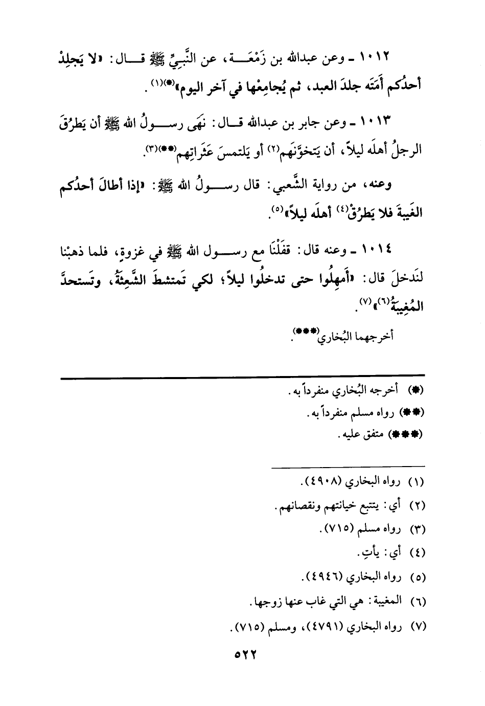 1013 - وعن جابر بن عبد اللَّه قال: نهَى رسولُ اللَّه -صلى اللَّه عليه وسلم- أن يَطرُقَ الرجلُ أهلَه ليلًا، أن يَتخوَّنهَم (¬2) أو يَلتمسَ عَثَراتِهم (**) (¬3).