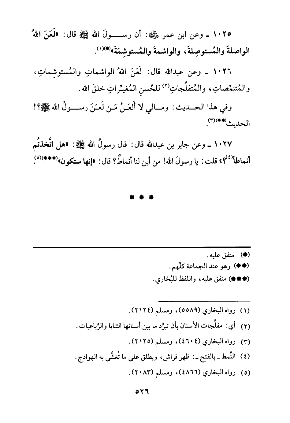 1025 - وعن ابن عمر -رضي اللَّه عنهما-: أن رسولَ اللَّه -صلى اللَّه عليه وسلم- قال: "لَعَنَ اللَّهُ الواصلةَ والمُستوصِلةَ، والواشمةَ والمُستوشِمَةَ" (*) (¬1).