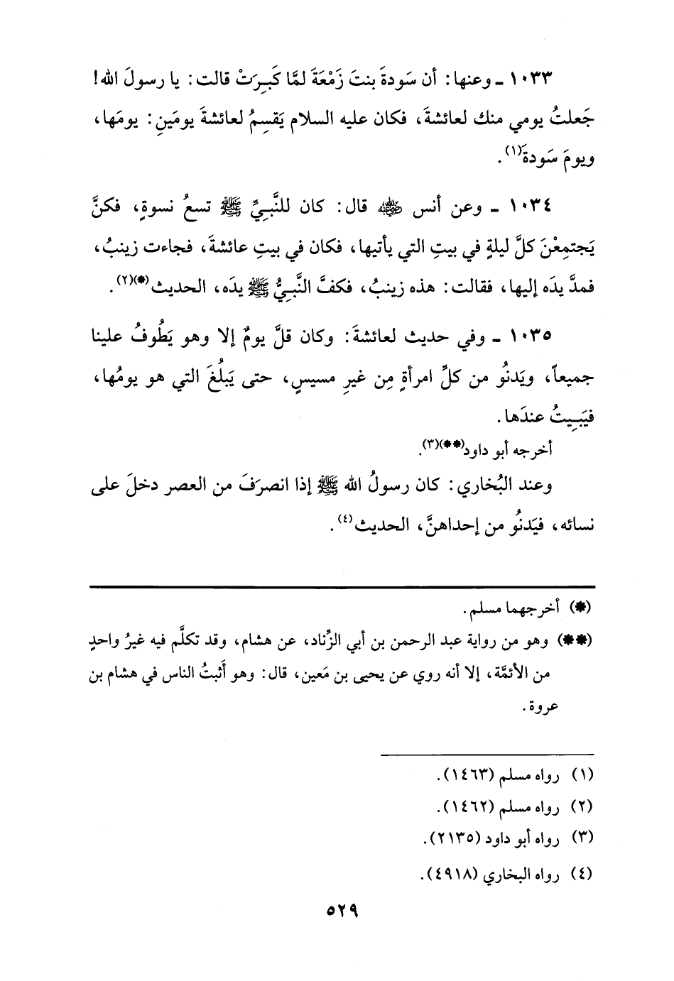 1033 - وعنها: أن سَودةَ بنتَ زَمْعَةَ لمَّا كَبِرَتْ قالت: يا رسولَ اللَّه! جَعلتُ يومي منك لعائشةَ، فكان عليه السلام يَقسِمُ لعائشةَ يومَينِ: يومَها، ويوم سَودةَ (¬1).