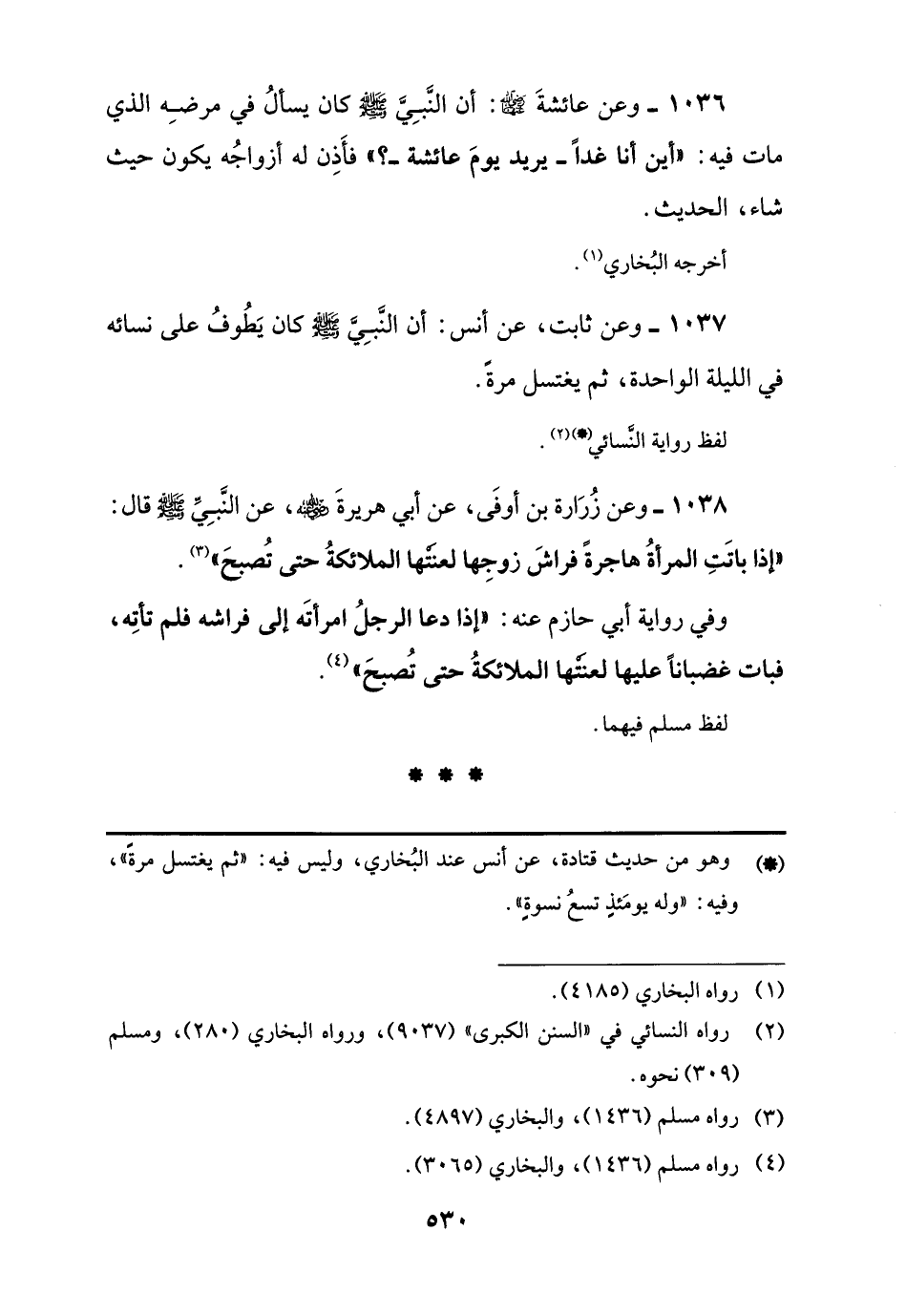 1038 - وعن زُرَارة بن أوفَى، عن أبي هريرةَ -رضي اللَّه عنه-، عن النَّبِيِّ -صلى اللَّه عليه وسلم- قال: "إذا باتَتِ المرأةُ هاجرةً فراشَ زوجِها لعنَتْها الملائكةُ حتى تُصبحَ" (¬3).