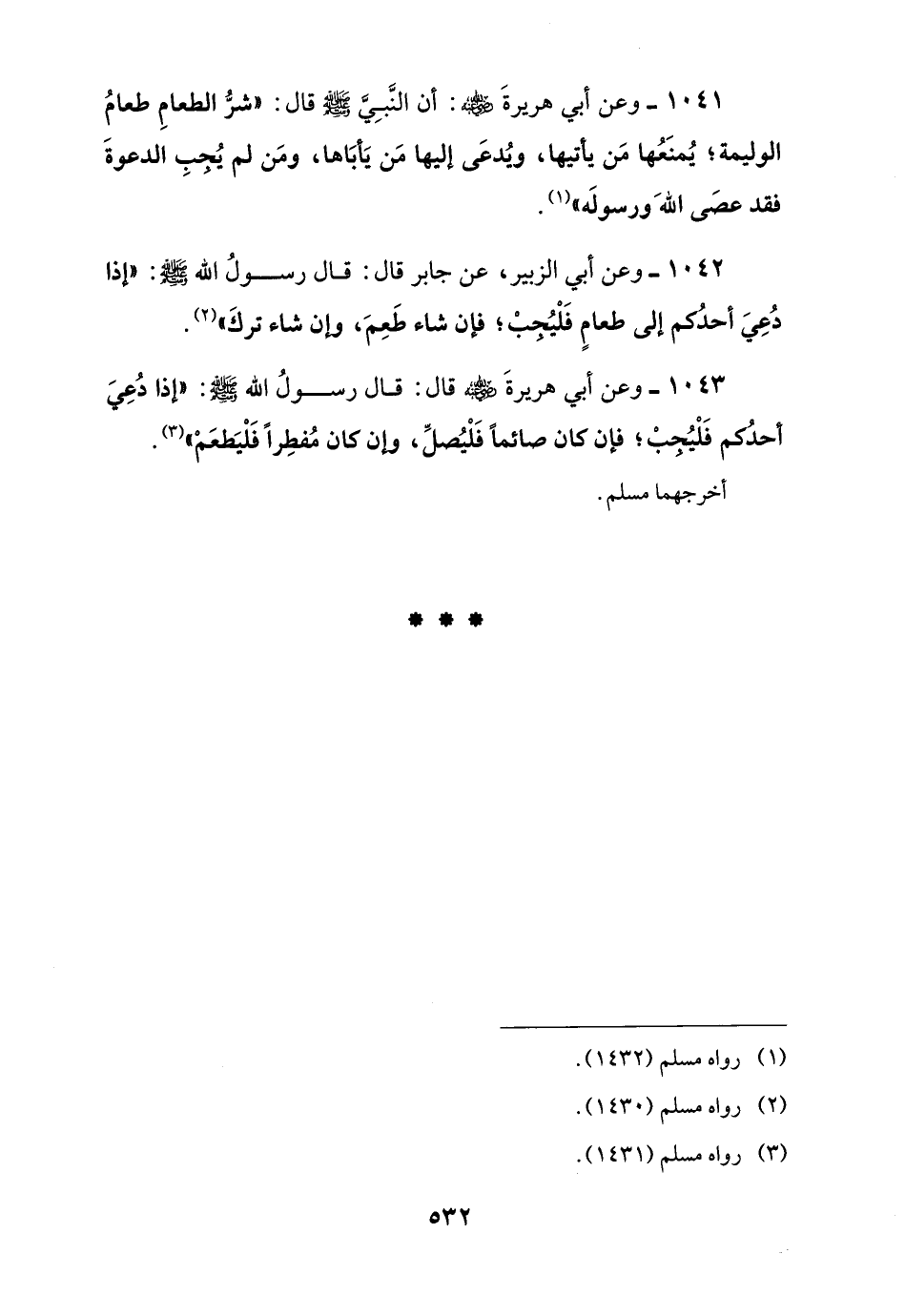 1041 - وعن أبي هريرةَ -رضي اللَّه عنه-: أن النَّبِيَّ -صلى اللَّه عليه وسلم- قال: "شرُّ الطعامِ طعامُ الوليمة؛ يُمنَعُها مَن يأتيها، ويُدعَى إليها مَن يَأبَاها، ومَن لم يُجبِ الدعوةَ فقد عصَى اللَّهَ ورسولَه" (¬1).