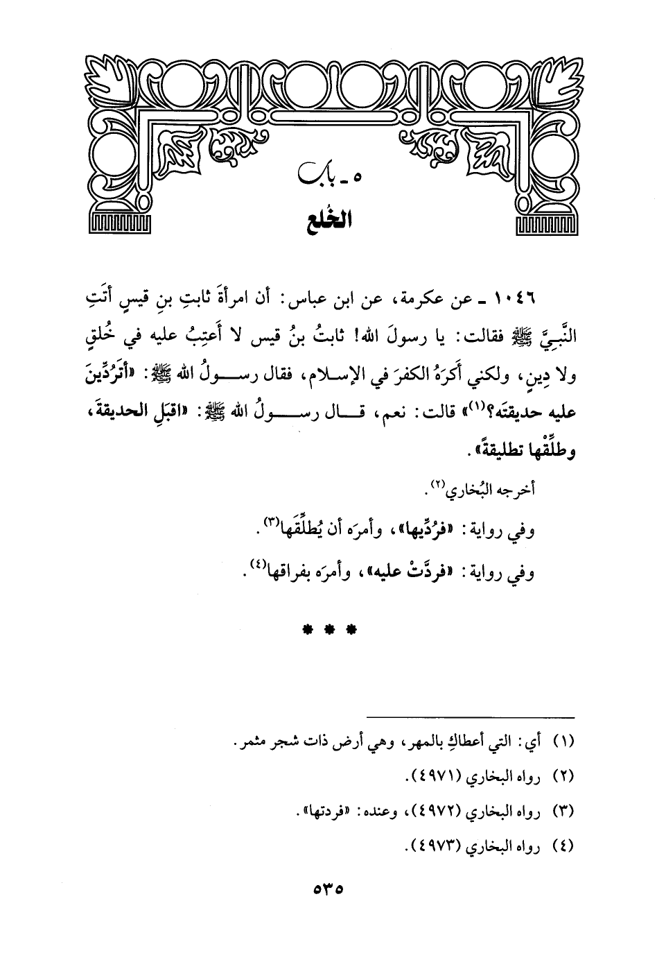 1046 - عن عكرمة، عن ابن عباس: أن امرأةَ ثابتِ بنِ قيسٍ أتَتِ النَّبِيَّ -صلى اللَّه عليه وسلم- فقالت: يا رسولَ اللَّه! ثابتُ بنُ قيس لا أَعتِبُ عليه في خُلقٍ ولا دِينٍ، ولكني أَكرَهُ الكفرَ في الإسلام، فقال رسولُ اللَّه -صلى اللَّه عليه وسلم-: "أتَرُدِّينَ عليه حديقتَه؟ (¬1) " قالت: نعم، قال رسولُ اللَّه -صلى اللَّه عليه وسلم-: "اقبَلِ الحديقةَ، وطلِّقْها تطليقةً".