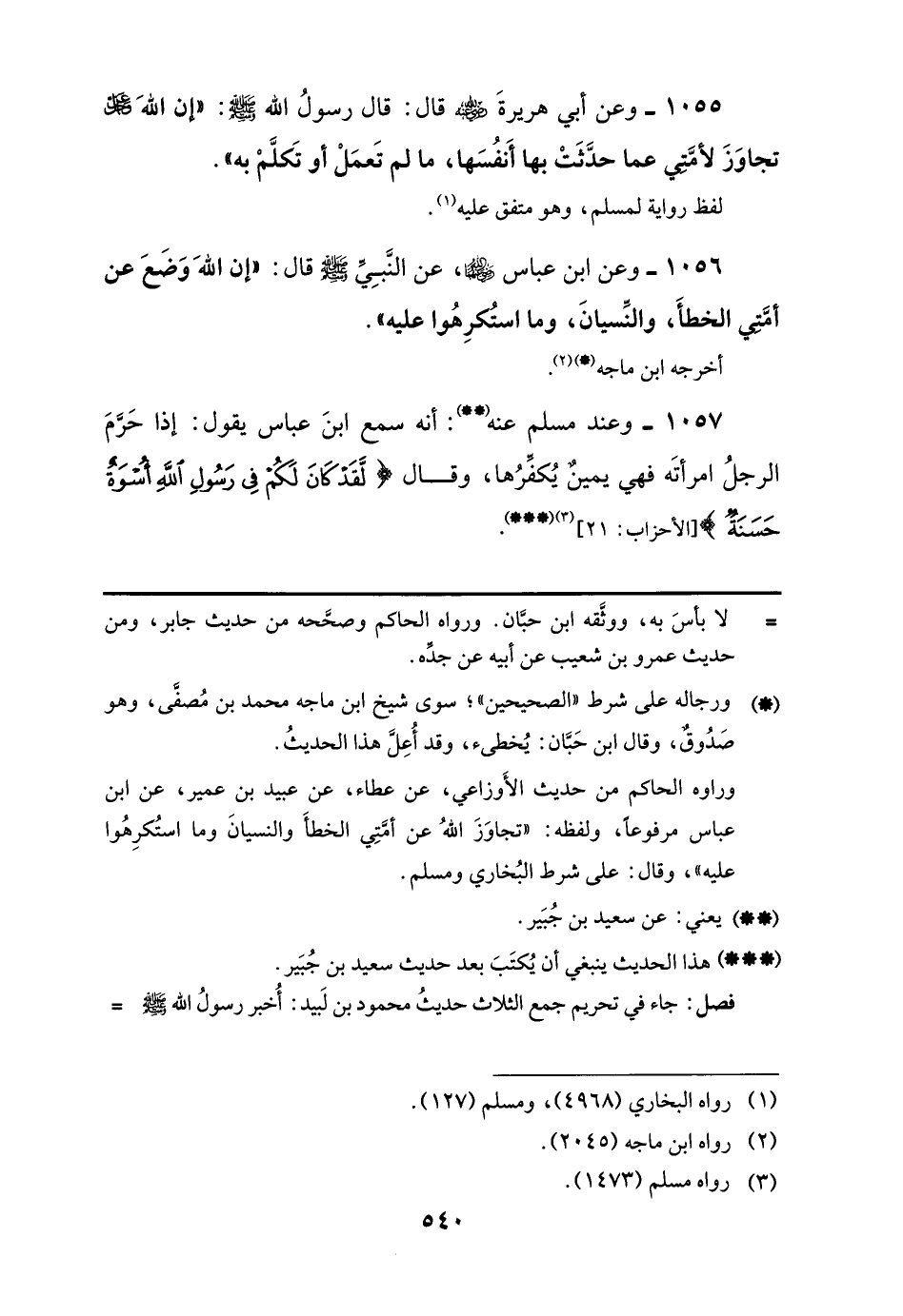 1056 - وعن ابن عباس -رضي اللَّه عنهما-، عن النَّبِيِّ -صلى اللَّه عليه وسلم- قال: "إن اللَّهَ وَضَعَ عن أمَّتِي الخطأَ، والنِّسيانَ، وما استُكرِهُوا عليه".