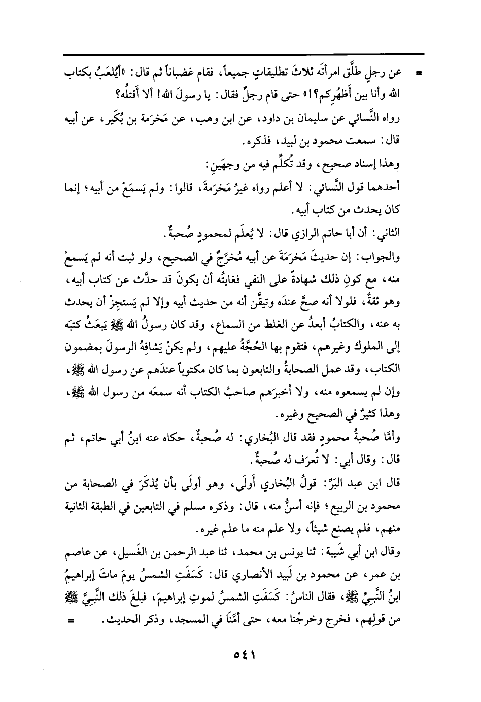 وأمَّا صُحبةُ محمودٍ فقد قال البُخاري: له صُحبةٌ، حكاه عنه ابنُ أبي حاتم، ثم قال: وقال أَبى: لا تُعرَف له صُحبةٌ.