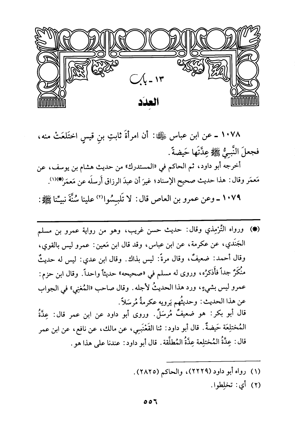 (*) ورواه التِّرْمِذي وقال: حديث حسن غريب، وهو من رواية عمرو بن مسلم الجَنَدي، عن عكرمة، عن ابن عباس، وقد قال ابن مَعين: عمرو ليس بالقوي، وقال أحمد: ضعيفٌ، وقال مرةً: ليس بذاك. وقال ابن عدي: ليس له حديثٌ منكَرٌ جدًا فأَذكرُه، وروى له مسلم في "صحيحه" حديثا واحدًا. وقال ابن حزم: عمرو ليس بشيءٍ، ورد هذا الحديثُ لأجله. وقال صاحب "المُغنِي" في الجواب عن هذا الحديث: وحديثُهم يَرويه عكرمةُ مُرسَلًا.
