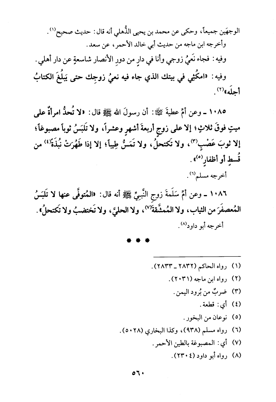 1085 - وعن أمِّ عطيةَ -رضي اللَّه عنها-: أن رسولَ اللَّه -صلى اللَّه عليه وسلم- قال: "لا تُحدُّ امرأةٌ على ميتٍ فوقَ ثلاثٍ؛ إلا على زوجٍ أربعةَ أشهرٍ وعشرًا، ولا تَلبَسُ ثوبًا مصبوغًا؛ إلا ثوبَ عَصْبٍ (¬3)، ولا تَكتحلُ، ولا تَمَسُّ طِيبًا؛ إلا إذا طَهُرَتْ نبُذَةً (¬4) من قُسطٍ أو أظفارٍ (¬5) ".