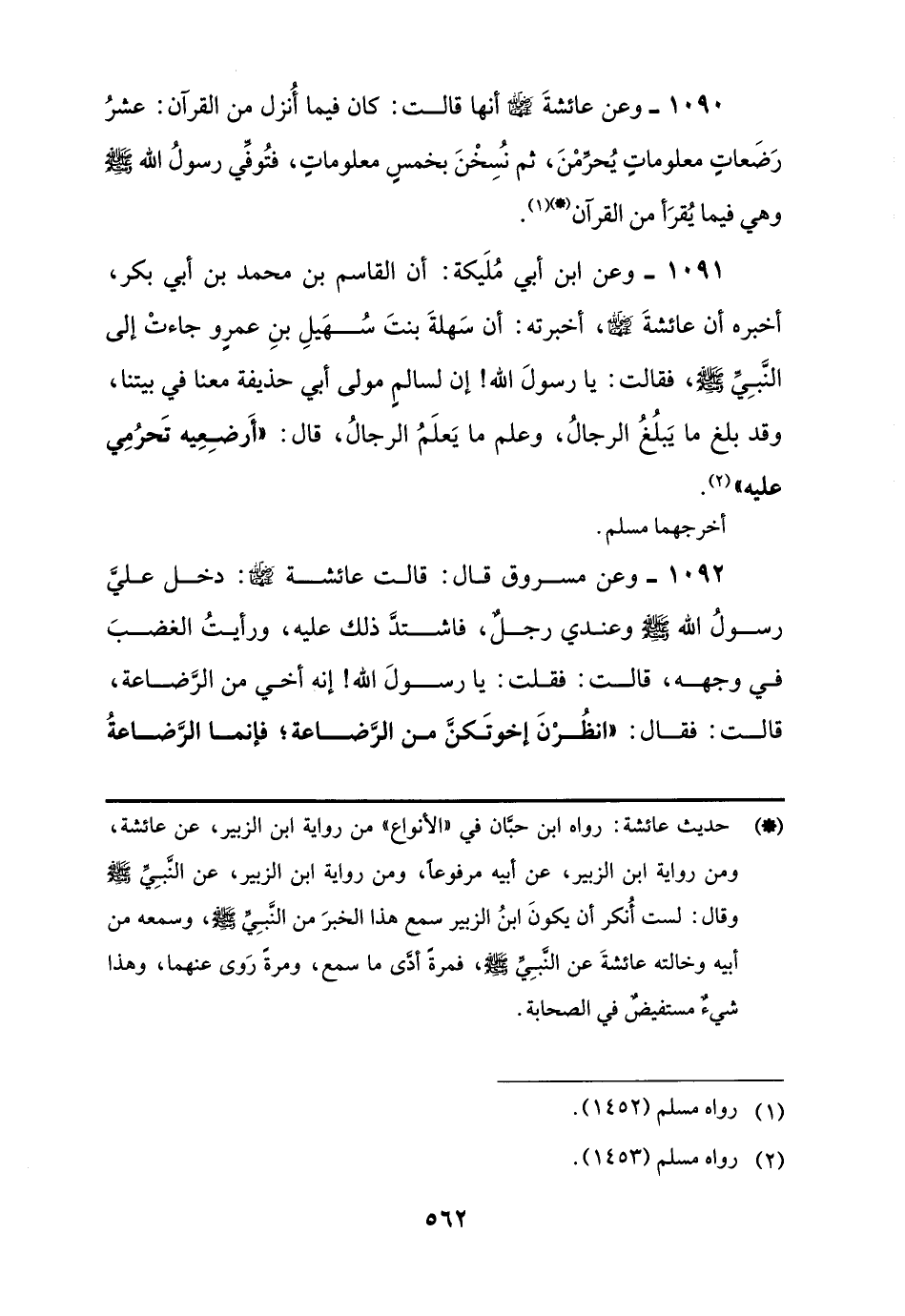 1090 - وعن عائشةَ -رضي اللَّه عنها- أنها قالت: كان فيما أُنزل من القرآن: عشرُ رَضَعاتٍ معلوماتٍ يُحرِّمْنَ، ثم نُسِخْنَ بخمسٍ معلوماتٍ، فتُوفِّي رسولُ اللَّه -صلى اللَّه عليه وسلم- وهي فيما يُقرَأ من القرآن (*) (¬1).