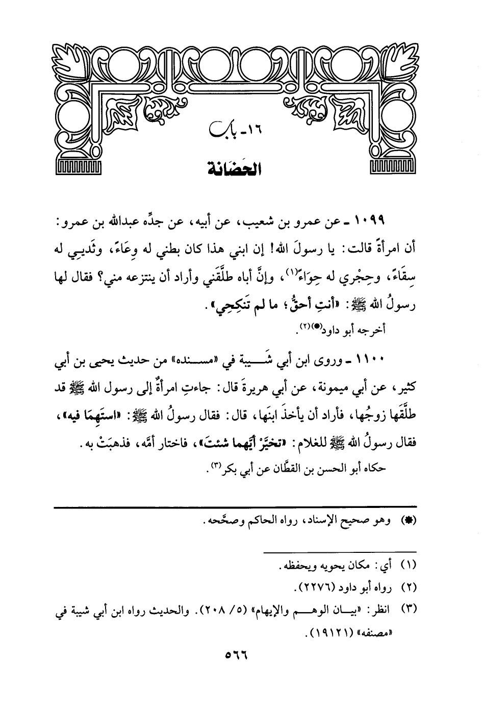 1099 - عن عمرو بن شعيب، عن أبيه، عن جدِّه عبد اللَّه بن عمرو: أن امرأةً قالت: يا رسولَ اللَّه! إن ابني هذا كان بطني له وِعَاءً، وثَديِي له سِقَاءً، وحِجْري له حِوَاءً (¬1)، وإنَّ أباه طلَّقَني وأراد أن ينتزعه مني؟ فقال لها رسولُ اللَّه -صلى اللَّه عليه وسلم-: "أنتِ أحقُّ؛ ما لم تَنكِحِي".