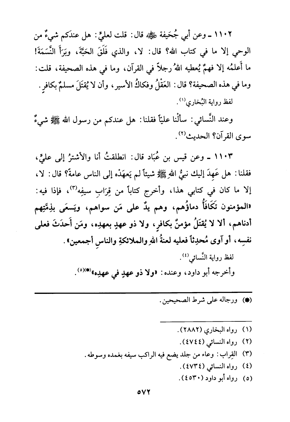 1102 - وعن أبي جُحَيفة -رضي اللَّه عنه- قال: قلت لعليٍّ: هل عندَكم شيءٌ من الوحي إلا ما في كتاب اللَّه؟ قال: لا، والذي فَلَقَ الحَبَّةَ، وبَرَأَ النَّسَمَةَ! ما أَعلمُه إلا فهمٌ يُعطيه اللَّهُ رجلًا في القرآن، وما في هذه الصحيفة، قلت: وما في هذه الصحيفة؟ قال: العَقْلُ وفكاكُ الأسير، وأن لا يُقتَلَ مسلمٌ بكافرٍ.