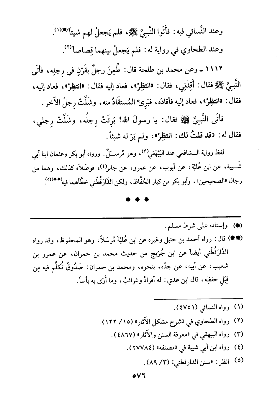 1112 - وعن محمد بن طلحة قال: طُعِنَ رجلٌ بقَرْنٍ في رِجلِه، فأتَى النَّبِيَّ -صلى اللَّه عليه وسلم- فقال: أَقِدْنِي، فقال: "انتظِرْ"، فعاد إليه فقال: "انتظِرْ"، فعاد إليه، فقال: "انتظِرْ"، فعاد إليه فأقادَه، فبَرِئ المُستقَادُ منه، وشَلَّتْ رِجلُ الآخر.