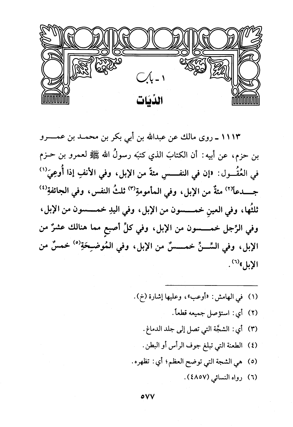 1113 - روى مالك عن عبد اللَّه بن أبي بكر بن محمد بن عمرو بن حزم، عن أبيه: أن الكتابَ الذي كتبَه رسولُ اللَّه -صلى اللَّه عليه وسلم- لعمرو بن حزم في العُقُول: "إن في النفسِ مئةً من الإبل، وفي الأنفِ إذا أُوعِيَ (¬1) جدعًا (¬2) مئةٌ من الإبل، وفي المأمومةِ (¬3) ثلثُ النفس، وفي الجائفةِ (¬4) ثلثُها، وفي العينِ خمسون من الأبل، وفي اليدِ خمسون من الإبل، وفي الرِّجل خمسون من الإبل، وفي كلِّ أصبعٍ مما هنالك عشرٌ من الإبل، وفي السِّنِّ خمسٌ من الإبل، وفي المُوضِحَةِ (¬5) خمسٌ من الإبل" (¬6).