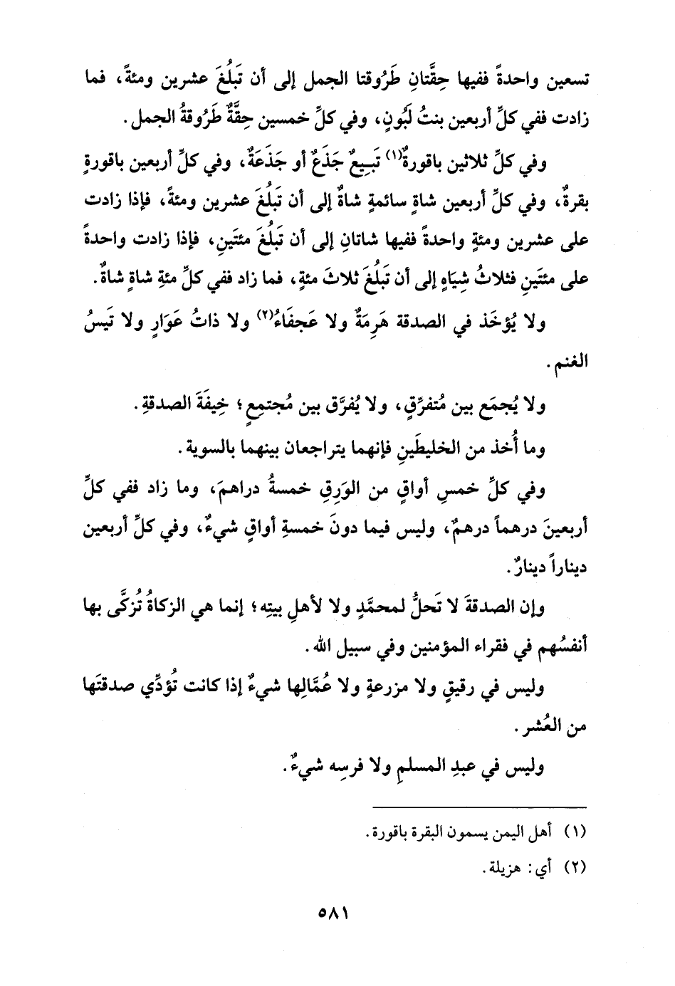 تسعين واحدةً ففيها حِقَّتانِ طَرُوقتا الجمل إلى أن تَبلُغَ عشرين ومئةً، فما زادت ففي كلِّ أربعين بنتُ لَبُونٍ، وفي كلِّ خمسين حِقَّةٌ طَرُوقةُ الجمل.