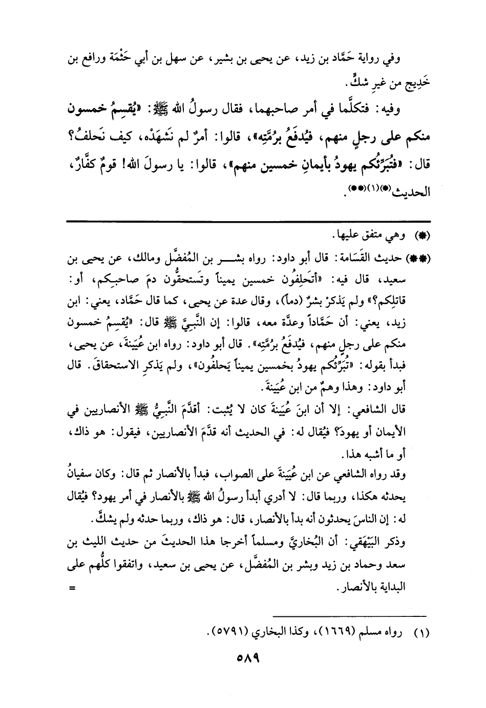 (**) حديث القَسَامة: قال أبو داود: رواه بشر بن المُفضَّل ومالك، عن يحيى بن سعيد، قال فيه: "أتحَلِفوُن خمسين يمينًا وتسَتحقُّون دمَ صاحبِكم، أو: قاتلِكم؟ " ولم يَذكرْ بشرٌ (دمًا)، وقال عدة عن يحيى، كما قال حَمَّاد، يعني: ابن زيد، يعني: أن حَمَّادًا وعدَّة معه، قالوا: إن النَّبِيَّ -صلى اللَّه عليه وسلم- قال: "يُقسِمُ خمسون منكم على رجلٍ منهم، فيُدفَعُ برُمَّتِه". قال أبو داود: رواه ابن عُيَينةَ، عن يحيى، فبدأ بقوله: "تُبَرِّئُكم يهودُ بخمسين يمينًا يَحلفُون"، ولم يَذكرِ الاستحقاقَ. قال أبو داود: وهذا وهمٌ من ابن عُيَينةَ.