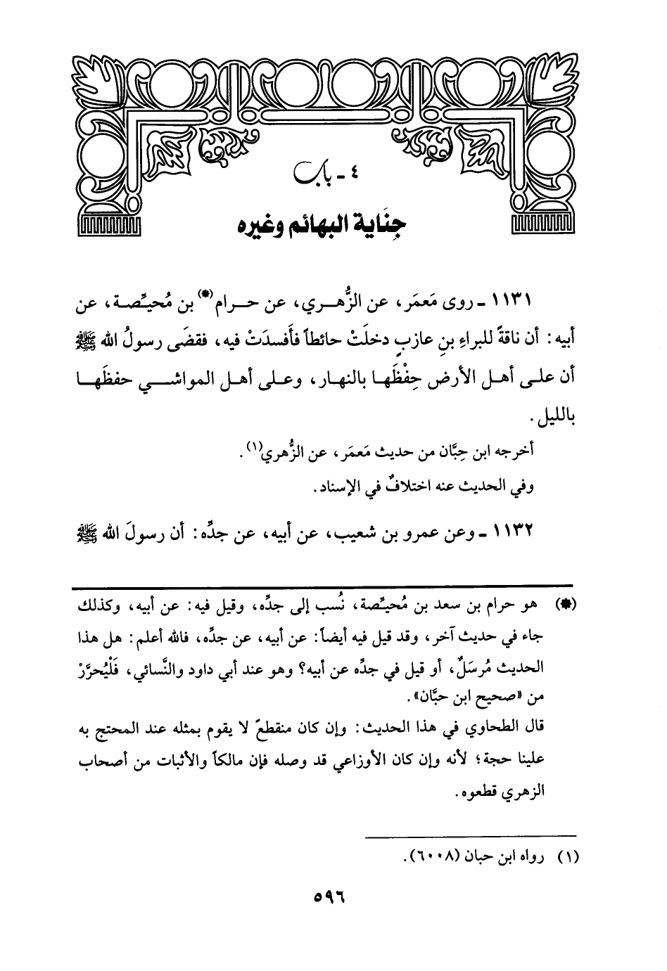 1131 - روى مَعمَر، عن الزُّهري، عن حرام (*) بن مُحيِّصة، عن أبيه: أن ناقةً للبراص بنِ عازبٍ دخلَتْ حائطًا فأَفسدَتْ فيه، فقضَى رسولُ اللَّه -صلى اللَّه عليه وسلم- أن على أهل الأرض حِفْظَها بالنهار، وعلى أهل المواشي حفظَها بالليل.