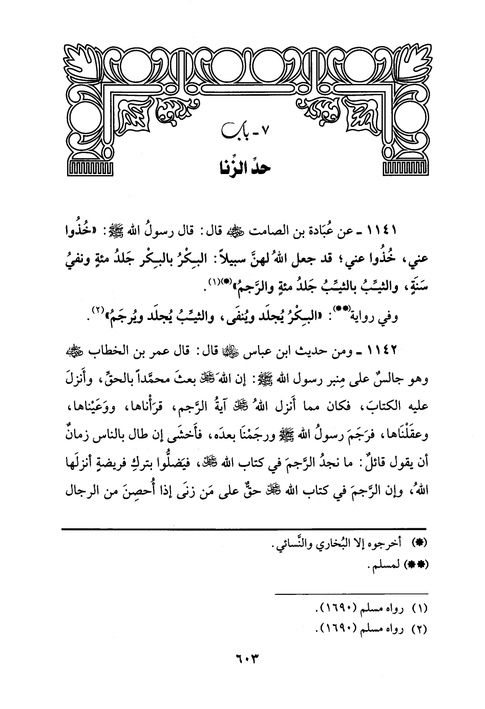 1141 - عن عُبَادة بن الصامت -رضي اللَّه عنه- قال: قال رسولُ اللَّه -صلى اللَّه عليه وسلم-: "خُذُوا عني، خُذُوا عني؛ قد جعل اللَّهُ لهنَّ سبيلًا: البِكْرُ بالبِكْر جَلدُ مئةٍ ونفيُ سَنَةٍ، والثيِّبُ بالثيِّبُ جَلدُ مئةٍ والرَّجمُ" (*) (¬1).