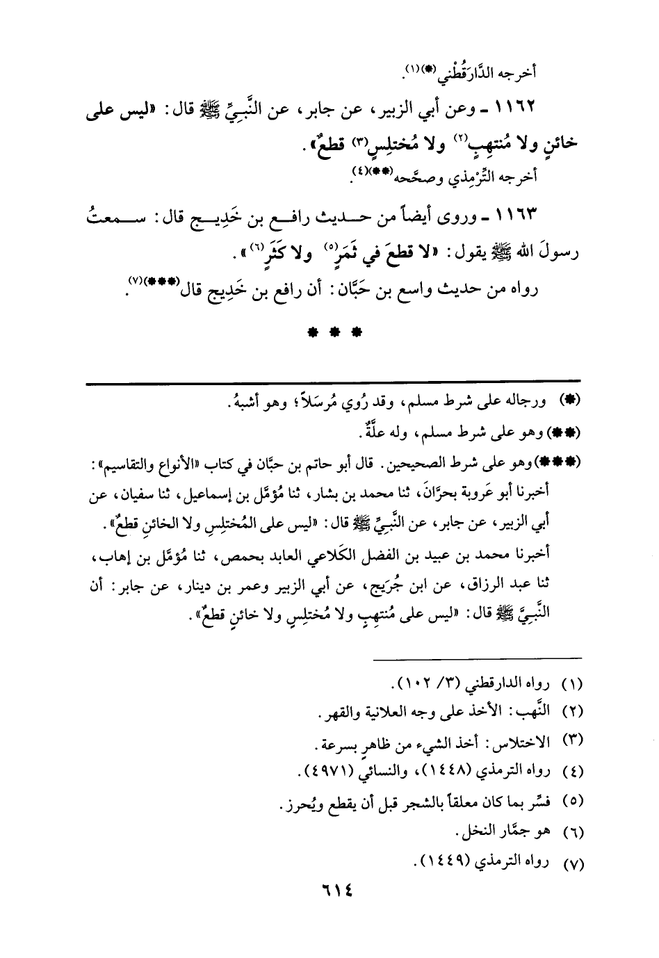 1162 - وعن أبي الزبير، عن جابر، عن النَّبِيِّ -صلى اللَّه عليه وسلم- قال: "ليس على خائنٍ ولا مُنتهِبٍ (¬2) ولا مُختلِسٍ (¬3) قطعٌ".