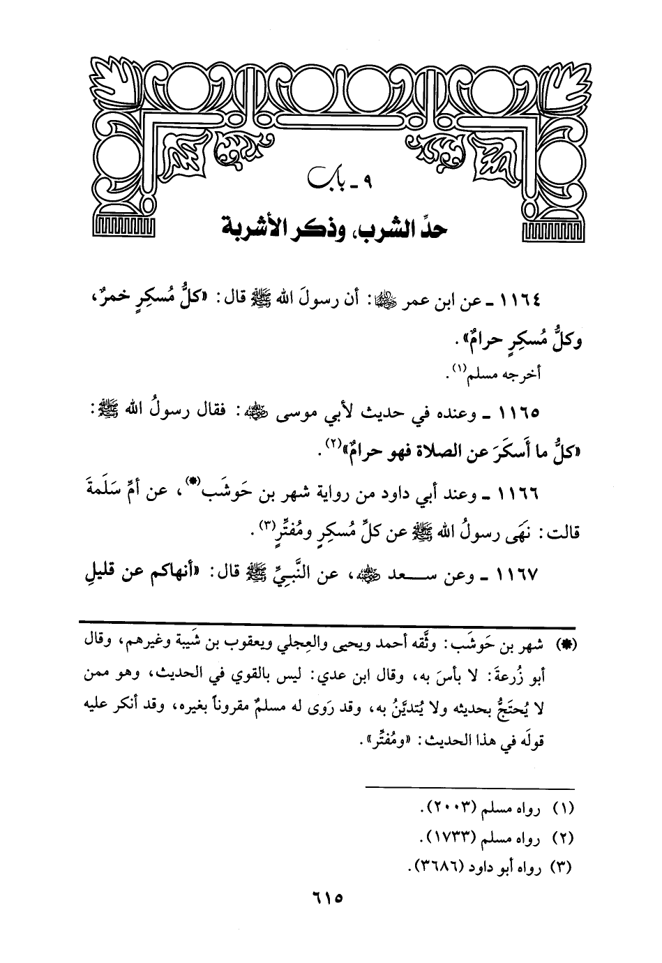 1166 - وعند أبي داود من رواية شهر بن حَوشَب (*)، عن أمِّ سَلَمةَ قالت: نَهَى رسولُ اللَّه -صلى اللَّه عليه وسلم- عن كل مُسكِرٍ ومُفتِّرٍ (¬3).