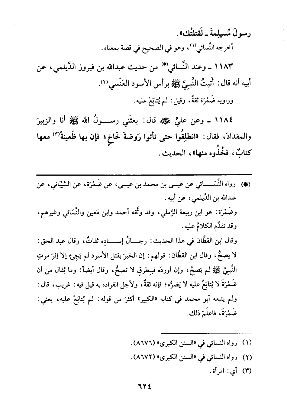 1183 - وعند النَّسائي (*) من حديث عبد اللَّه بن فيروز الدَّيلمي، عن أبيه أنه قال: أَتيتُ النَّبِيَّ -صلى اللَّه عليه وسلم- برأس الأسود العَنْسي (¬2).