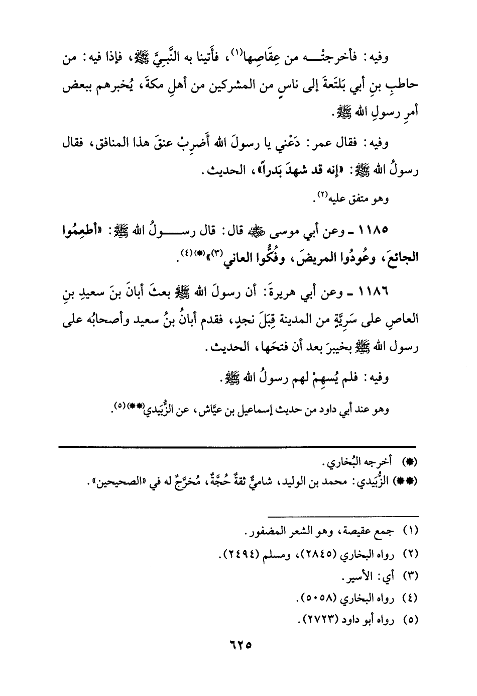 1186 - وعن أبي هريرةَ: أن رسولَ اللَّه -صلى اللَّه عليه وسلم- بعثَ أبانَ بنَ سعيدِ بنِ العاصِ على سَرِيَّةٍ من المدينة قِبَلَ نجدٍ، فقدم أبانُ بنُ سعيد وأصحابُه على رسول اللَّه -صلى اللَّه عليه وسلم- بخيبرَ بعد أن فتحَها، الحديث.
