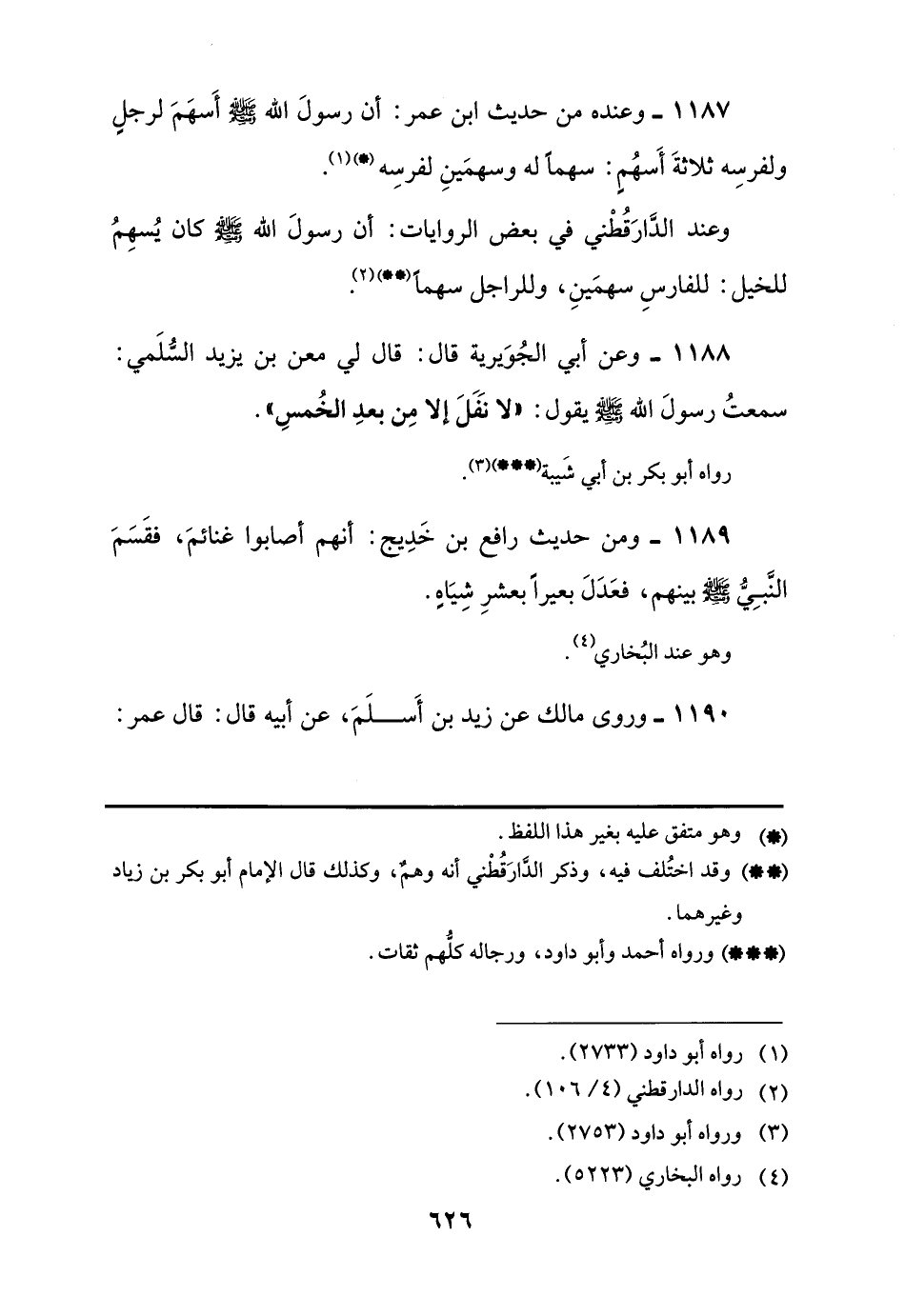 1187 - وعنده من حديث ابن عمر: أن رسولَ اللَّه -صلى اللَّه عليه وسلم- أَسهَمَ لرجلٍ ولفرسِه ثلاثةَ أَسهُمٍ: سهمًا له وسهمَينِ لفرسِه (*) (¬1).
