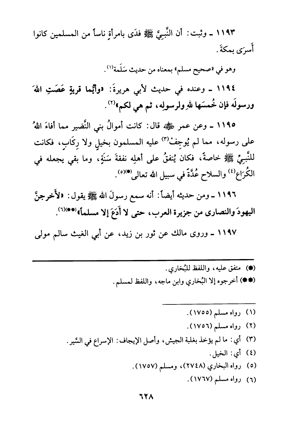 1195 - وعن عمر -رضي اللَّه عنه- قال: كانت أموالُ بني النَّضير مما أفاءَ اللَّهُ على رسوله، مما لم يُوجِفْ (¬3) عليه المسلمون بخيلٍ ولا رِكَابٍ، فكانت للنَّبِيِّ -صلى اللَّه عليه وسلم- خاصةً، فكان يُنفقُ على أهلِه نفقةَ سَنَةٍ، وما بقي يجعله في الكُرَاع (¬4) والسلاح عُدَّةً في سبيل اللَّه تعالى (*) (¬5).