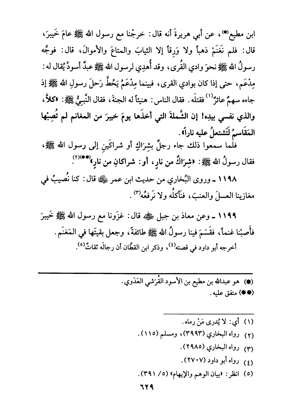ابن مطيع (*)، عن أبي هريرةَ أنه قال: خرجْنا مع رسول اللَّه -صلى اللَّه عليه وسلم- عامَ خَيبرَ، قال: فلم نَغنَمْ ذهبًا ولا وَرِقًا إلا الثيابَ والمتاعَ والأموالَ، قال: فوجَّه رسولُ اللَّه -صلى اللَّه عليه وسلم- نحوَ وادي القُرى، وقد أُهدِي لرسول اللَّه -صلى اللَّه عليه وسلم- عبدٌ أسودُ يُقال له: مِدْعَم، حتى إذا كان بوادي القرى، فبينما مِدْعَمُ يَحُطَّ رَحلَ رسولِ اللَّه -صلى اللَّه عليه وسلم- إذ جاءه سهمٌ عائرٌ (¬1) فقتلَه. فقال الناس: هنيئًا له الجنةَ، فقال النَّبِيُّ -صلى اللَّه عليه وسلم-: "كلَّا، والذي نفسي بيدِه! إن الشَّملةَ التي أخذَها يومَ خيبرَ من المغانم لم تُصِبْها المَقَاسمُ لتشتعلُ عليه نارًا".