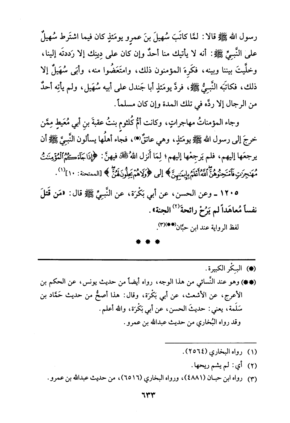 1205 - وعن الحسن، عن أبي بَكْرَة، عن النَّبِىِّ -صلى اللَّه عليه وسلم- قال: "مَن قَتلَ نفسًا مُعاهَدًا لم يَرُحْ رائحةَ (¬2) الجنة".