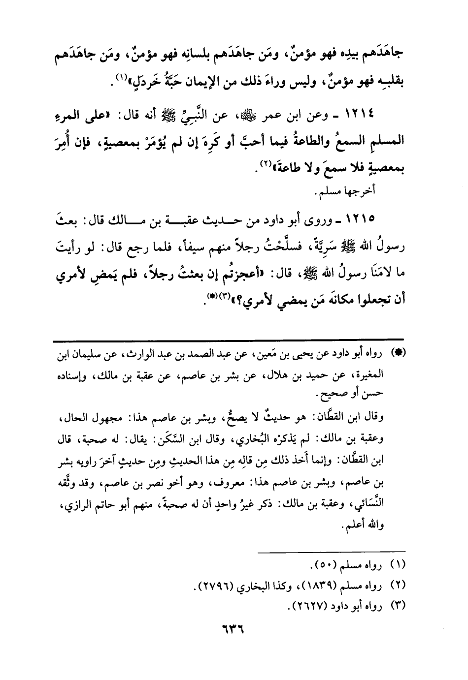 1214 - وعن ابن عمر -رضي اللَّه عنهما-، عن النَّبِيِّ -صلى اللَّه عليه وسلم- أنه قال: "على المرءِ المسلم السمعُ والطاعةُ فيما أحبَّ أو كَرِهَ إن لم يُؤمَرْ بمعصيةٍ، فإن أُمِرَ بمعصيةٍ فلا سمعَ ولاطاعةَ" (¬2).