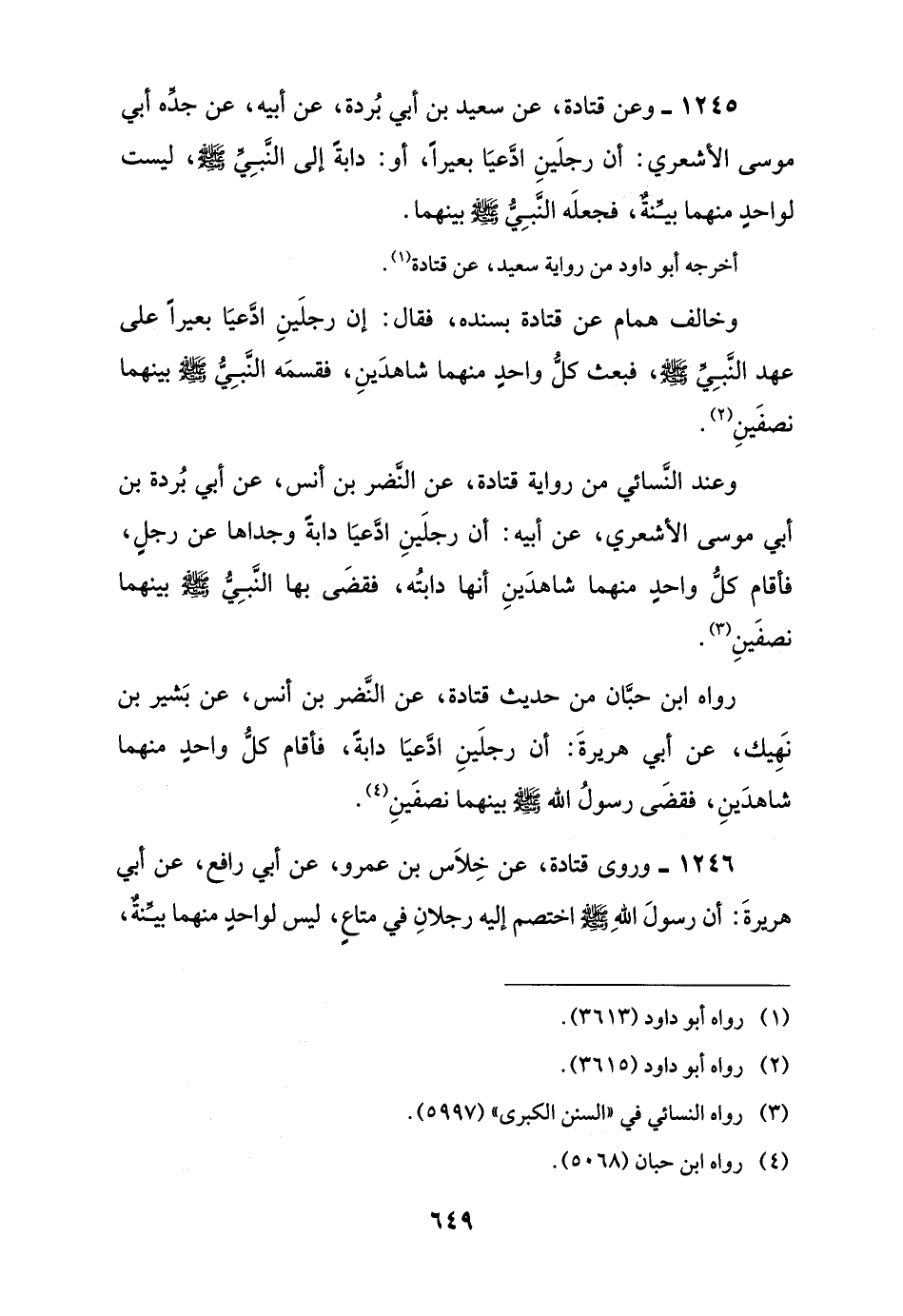 1245 - وعن قتادة، عن سعيد بن أبي بُردة، عن أبيه، عن جدِّه أبي موسى الأشعري: أن رجلَينِ ادَّعيَا بعيرًا، أو: دابةً إلى النَّبِيِّ -صلى اللَّه عليه وسلم-، ليست لواحدٍ منهما بيِّنةٌ، فجعلَه النَّبِيُّ -صلى اللَّه عليه وسلم- بينهما.