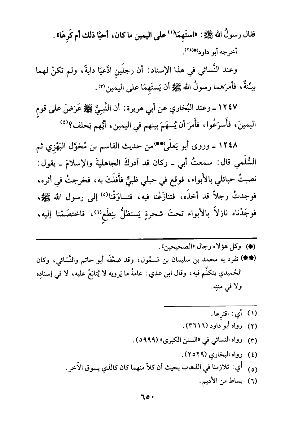 1247 - وعند البُخاري عن أبي هريرة: أن النَّبِيَّ -صلى اللَّه عليه وسلم- عَرَضَ على قومٍ اليمينَ، فأَسرَعُوا، فأَمرَ أن يُسهَمَ بينهم في اليمين، أيُّهم يَحلف؟ (¬4)