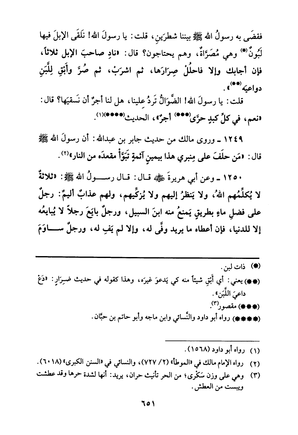 1250 - وعن أبي هريرةَ -رضي اللَّه عنه- قال: قال رسولُ اللَّه -صلى اللَّه عليه وسلم-: "ثلاثةٌ لا يُكلِّمُهم اللَّهُ، ولا يَنظرُ إليهم ولا يُزكِّيهم، ولهم عذابٌ أليمٌ: رجلٌ على فضلِ ماءً بطريقٍ يَمنعُ منه ابنَ السبيل، ورجلٌ بايَعَ رجلًا لا يُبايعُه إلا للدنيا، فإن أعطاه ما يريد وفَّى له، وإلا لم يَفِ له، ورجلٌ ساوَمَ