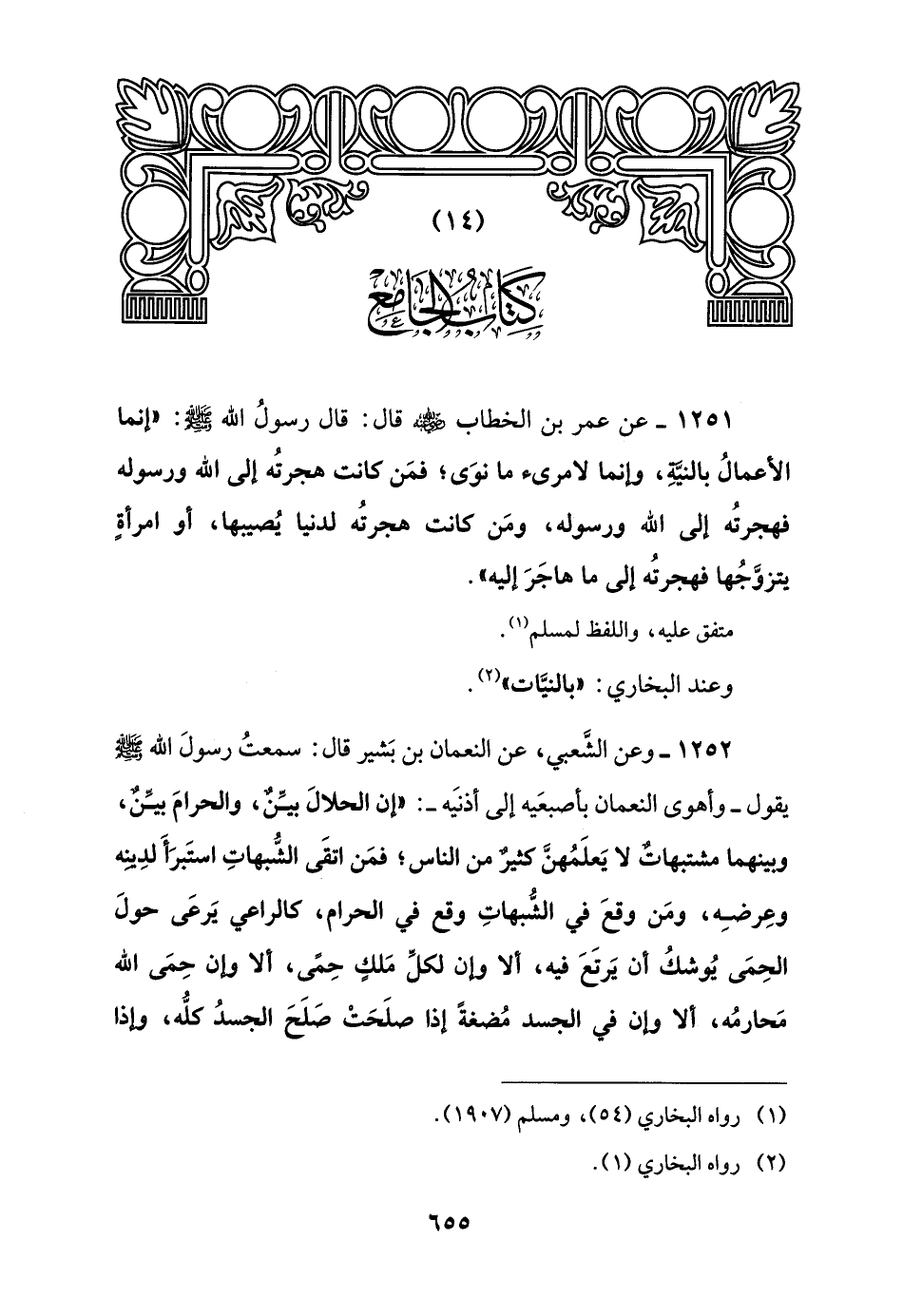 1251 - عن عمر بن الخطاب -رضي اللَّه عنه- قال: قال رسولُ اللَّه -صلى اللَّه عليه وسلم-: "إنما الأعمالُ بالنيَّةِ، وإنما لامرئ ما نوَى؛ فمَن كانت هجرتُه إلى اللَّه ورسوله فهجرتُه إلى اللَّه ورسوله، ومَن كانت هجرتُه لدنيا يُصيبها، أو امرأةٍ يتزوَّجُها فهجرتُه إلى ما هاجَرَ إليه".