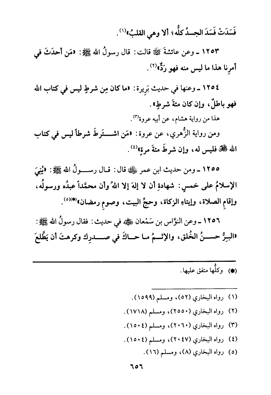 1256 - وعن النوَّاس بن سَمْعان -رضي اللَّه عنه- في حديث: فقال رسولُ اللَّه -صلى اللَّه عليه وسلم-: "البِرُّ حسنُ الخُلق، والأثمُ ما حاكَ في صدرِك وكرهتَ أن يَطَّلعَ