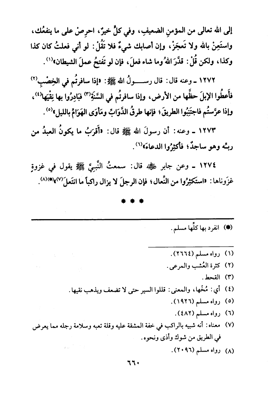 1272 - وعنه قال: قال رسولُ اللَّه -صلى اللَّه عليه وسلم-: "إذا سافرتُم في الخِصْبِ (¬2) فأَعَطُوا الإبلَ حظَّها من الأرض، وإذا سافرتُم في السَّنَةِ (¬3) فبَادِرُوا بها نِقْيَها (¬4)، واذا عرَّستُم فاجتَنِبُوا الطريقَ؛ فإنها طرقُ الدَّوَابِّ ومَاوَى الهَوَامِّ بالليل" (¬5).