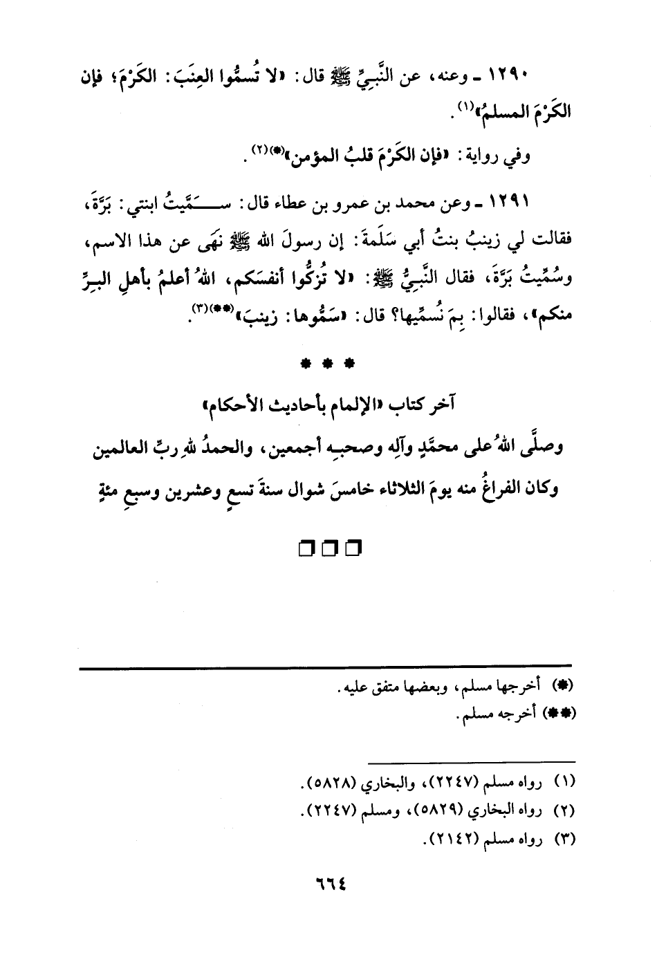 1290 - وعنه، عن النَّبِيِّ -صلى اللَّه عليه وسلم- قال: "لا تُسمُّوا العِنَبَ: الكَرْمَ؛ فإن الكَرْمَ المسلمُ" (¬1).