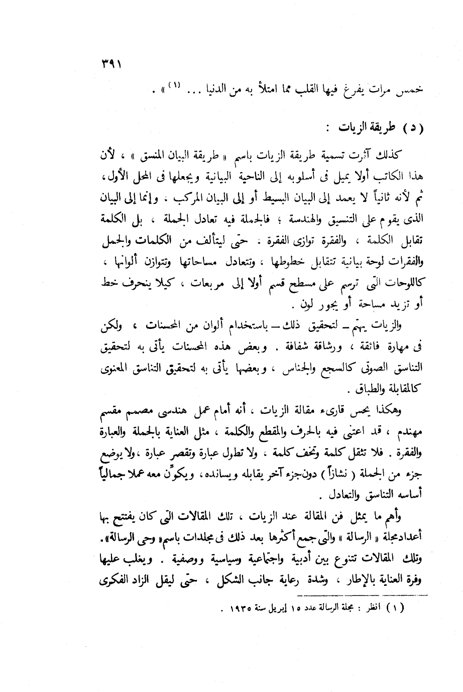وهكذا يحس قارئ مقالة الزيات، أنه أمام عمل هندسي مصمم مقسم مهندم، قد اعتنى فيه بالحرف والمقطع والكلمة، مثل العناية بالجملة والعبارة والفقرة. فلا تثقل كلمة وتخف كلمة، ولا تطول عبارة وتقصر عبارة، ولا يوضع جزء من الجملة "نشازًا" دون جزء آخر يقابله ويسانده، ويكون معه عملًا جماليًا أساسه التناسق والتعادل.