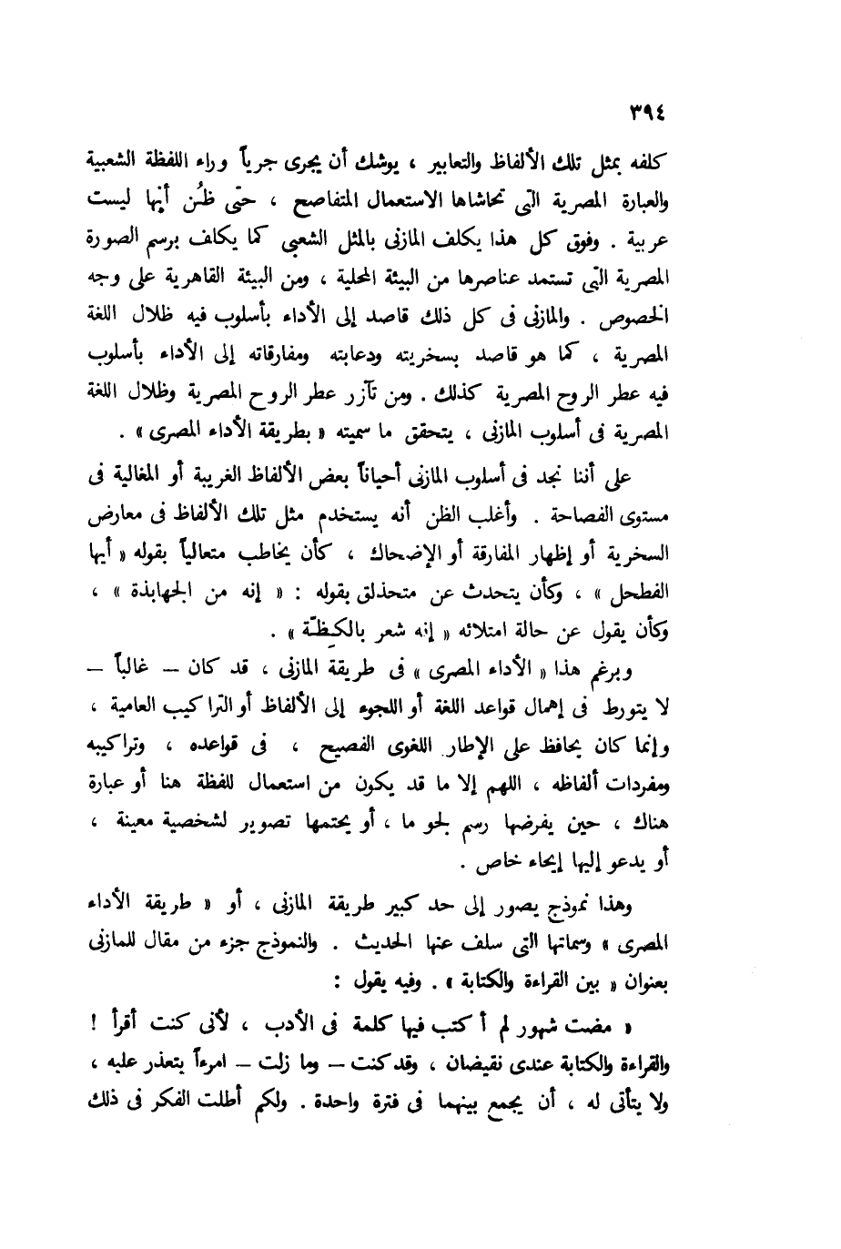 كلفه بمثل تلك الألفاظ والتعابير، يوشك أن يجري جريًا وراء اللفظة الشعبية والعبارة المصرية التي تحاشاها الاستعمال المتفاصح، حتى ظُن أنها ليست عربية. وفوق كل هذا يكلف المازني بالمثل الشعبي كما يكلف برسم الصورة المصرية التي تستمد عناصرها من البيئة المحلية، ومن البيئة القاهرية على وجه الخصوص. والمازني في كل ذلك قاصد إلى الأداء بأسلوب فيه ظلال اللغة المصرية، كما هو قاصد بسخريته ودعابته ومفارقاته إلى الأداء بأسلوب فيه عطر الروح المصرية كذلك، ومن تآزر عطر الروح المصرية، وظلال اللغة المصرية في أسلوب المازني، يتحقق ما سميته "بطريقة الأداء المصري".