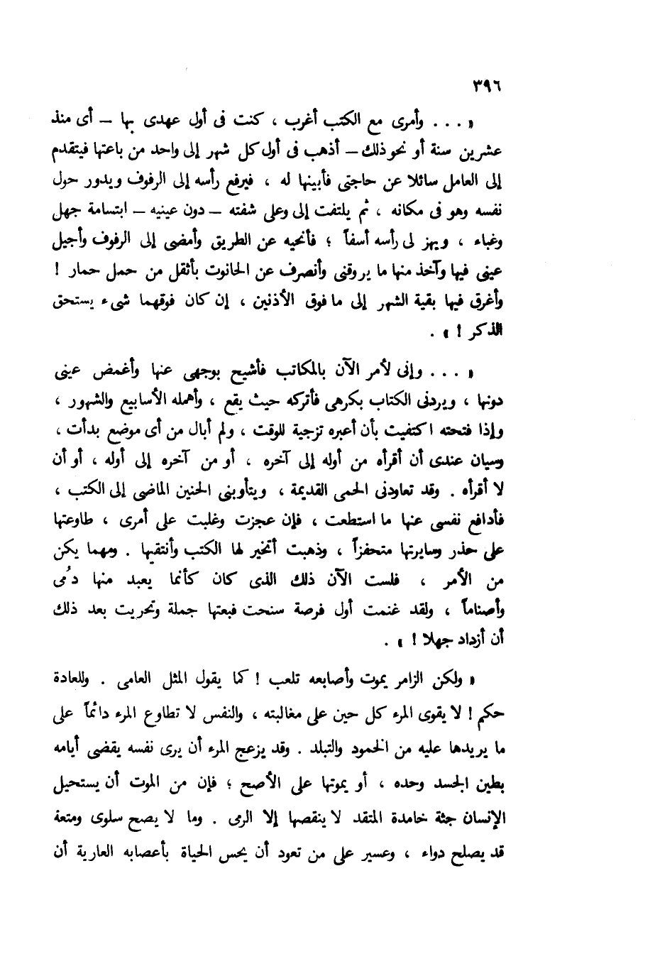 " ... وإني لأمر الآن بالمكاتب فأشيح بوجهي عنها وأغمض عيني دونها، ويردني الكتاب بكرهي فأتركه حيث يقع، وأهمله الأسابيع والشهور، وإذا فتحته اكتفيت بأن أعبره تزجية للوقت، ولم أبال من أي موضع بدأت، وسيان عندي أن أقرأه من أوله إلى آخره، أو من آخره إلى أوله، أو أن لا أقرأه، وقد تعاودني الحمى القديمة، ويتأوبني الحنين الماضي إلى الكتب، فأدافع نفسي عنها ما استطعت، فإن عجزت وغلبت على أمري، طاوعتها على حذر وسايرتها متحفزًا، وذهبت أتخير لها الكتب وأنتقيها، ومهما يكن من الأمر، فلست الآن ذلك الذي كان كأنما يعبد منها دمى وأصنامًا، ولقد غنمت أول فرصة سنحت فبعتها جملة، وتحريت بعد ذلك أن أزداد جهلًا! ".