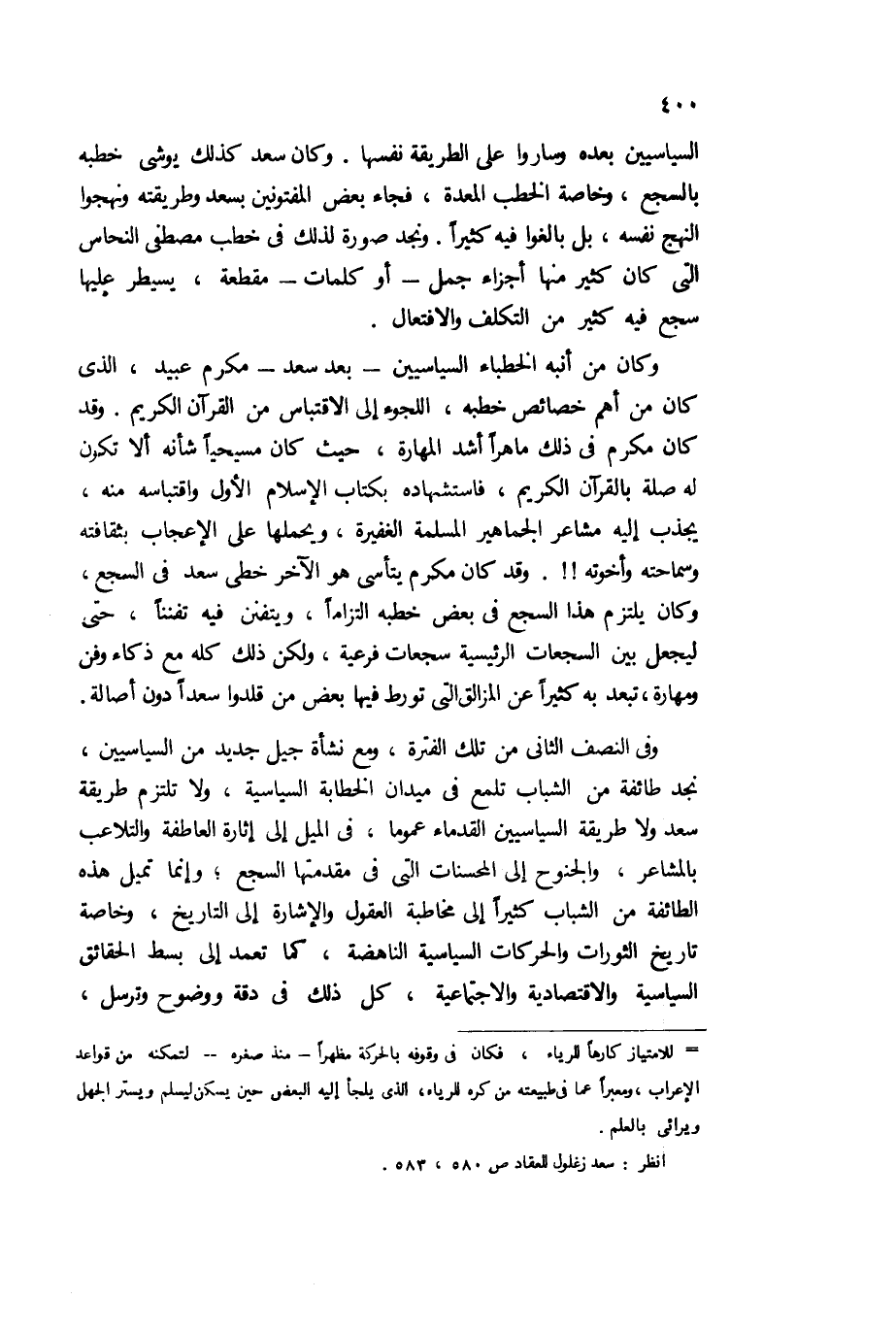 السياسيين بعده وساروا على الطريقة نفسها، وكان سعد كذلك يوشي خطبه بالسجع، وخاصة الخطب المعدة، فجاء بعض المفتونين بسعد وطريقته، ونهجوا النهج نفسه، بل بالغوا فيه كثيرًا، ونجد صورة لذلك في خطب مطصفى النحاس التي كان كثير منها أجزاء جمل -أو كلمات- مقطعة، يسيطر عليها سجع فيها كثيرمن التكلف والافتعال.