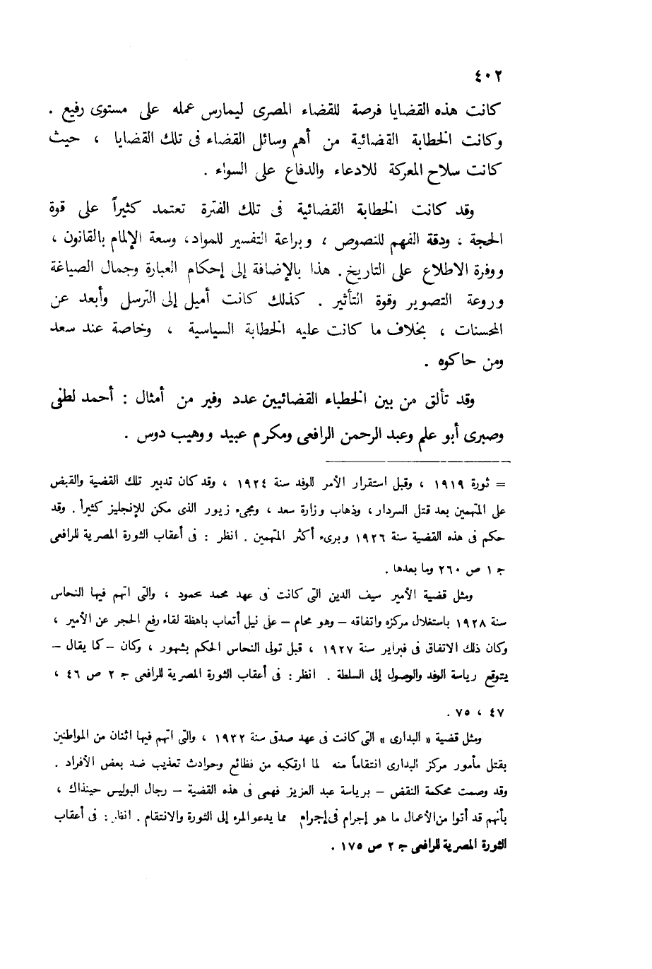 كانت هذه القضايا فرصة للقضاء المصري ليمارس عمله على مستوى رفيع، وكانت الخطابة القضائية من أهم وسائل القضاء في تلك القضايا، حيث كانت سلاح المعركة للادعاء، والدفاع على السواء.