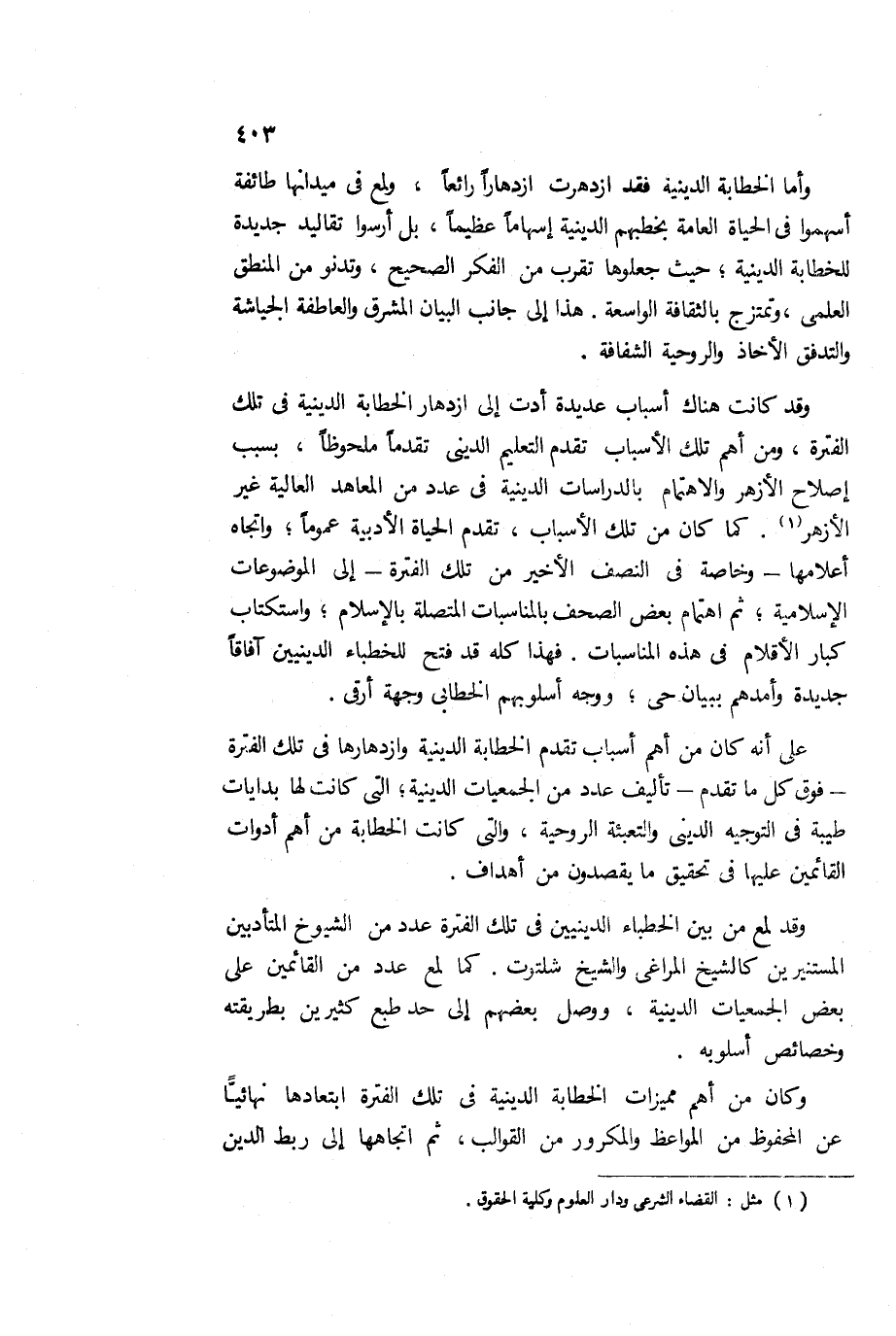 وقد كانت هناك أسباب عديدة أدت إلى ازدهار الخطابة الدينية في تلك الفترة، ومن أهم تلك الأسباب تقدم التعليم الديني تقدمًا ملحوظًا، بسبب إصلاح الأزهر، والاهتمام بالدراسات الدينية في عدد من المعاهد العالية غير الأزهر1. كما كان من تلك الأسباب، تقدم الحياة الأدبية عمومًا؛ واتجاه أعلامها -وخاصة في النصف الأخير من تلك الفترة- إلى الموضوعات الإسلامية، ثم اهتمام بعض الصحف بالمناسبات المتصلة بالإسلام؛ واستكتاب كبار الأقلام في هذه المناسبات، فهذا كله قد فتح للخطباء الدينيين آفاقًا جديدة، وأمدهم ببيان حي؛ ووجه أسلوبهم الخطابي، وجهة أرقى.