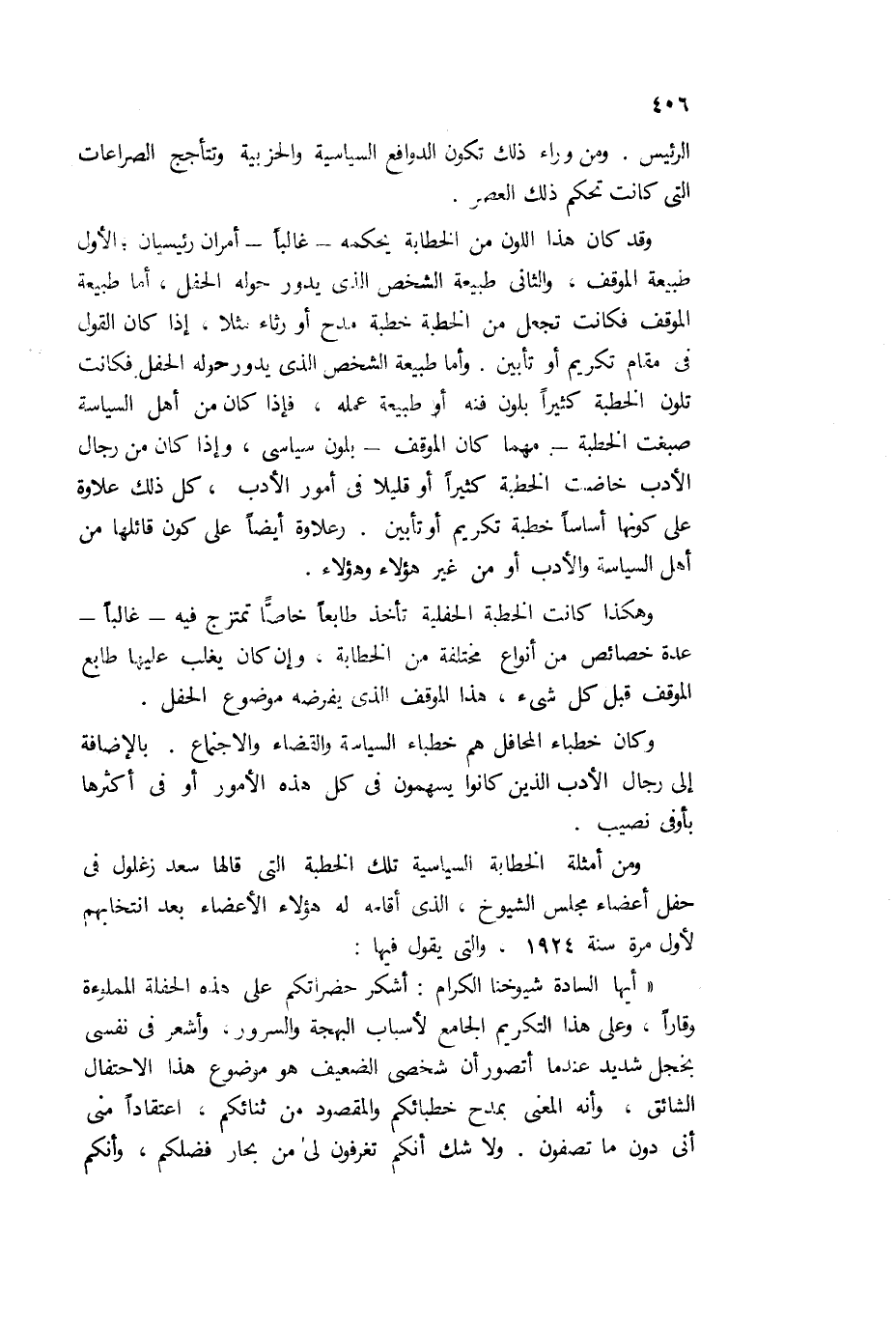 وقد كان هذا اللون من الخطابة يحكمه -غالبًا- أمران رئيسيان؛ الأول طبيعة الموقف، والثاني طبيعة الشخص الذي يدور حوله الحفل، أما طبيعة الموقف فكانت تجعل من الخطبة خطبة مدح أو رثاء مثلًا، إذا كانت القول في مقام تكريم أو تأبين، وأما طبيعة الشخص الذي يدور حوله الحفل، فكانت تلون الخطبة كثيرًا بلون فنه أو طبيعة عمله، فإذا كان من أهل السياسة صبغت الخطبة -مهما كان الموقف- بلون سياسي، وإذا كان من رجال الأدب خاضت الخطبة كثيرًا أو قليلًا في أمور الأدب، كل ذلك علاوة على كونها أساسًا خطبة تكريم أو تأبين، وعلاوة أيضًا على كون قائلها من أهل السياسة والأدب، أو من غير هؤلا وهؤلاء.