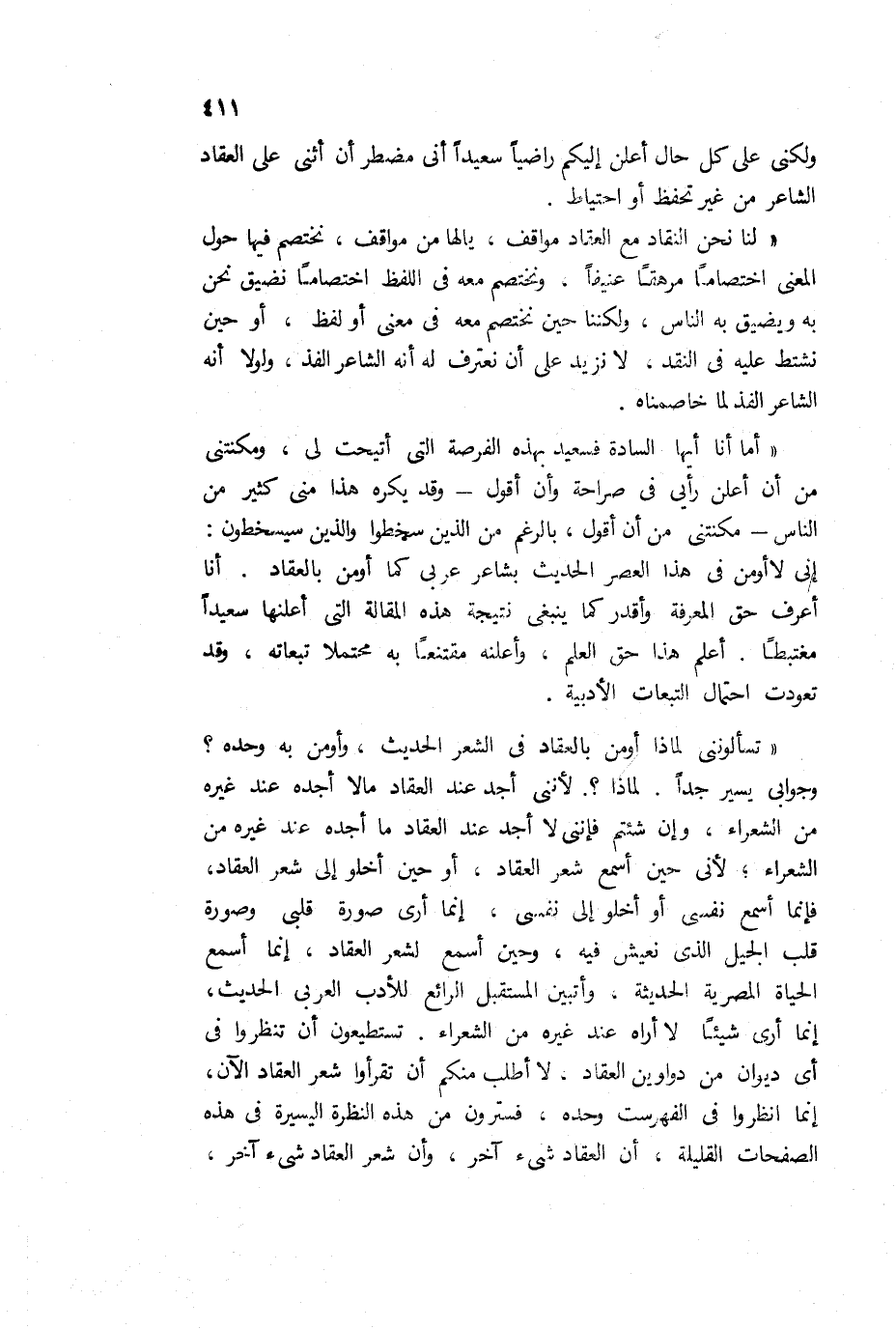 "أما أنا أيها السادة فسعيد بهذه الفرصة التي أتيحت لي، ومكنتني من أن أعلن رأيي في صراحة، وأن أقول -وقد يكره هذا مني كثير من الناس- مكنتني من أن أقول، بالرغم من الذين سخطوا والذين سيسخطون: أني لا أومن في هذا العصر الحديث بشاعر عربي كما أومن بالعقاد، أنا أعرف حق المعرفة وأقدر كما ينبغي نتيجة هذه المقالة التي أعلنها سعيدًا مغتبطًا، أعلم هذا حق العلم، وأعلنه مقتنعًا به محتملًا تبعاته، وقد تعودت احتمال التبعات الأدبية.