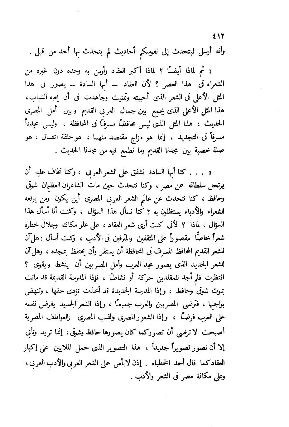 "ثم لماذا أيضًا؟ لماذا أكبر العقاد، وأومن به وحده دون غيره من الشعراء في هذا العصر؟ لأن العقاد -أيها السادة- يصور لي هذا المثل الأعلى في الشعر الذي أحببته، وتمنيت وجاهدت في أن يحبه الشباب، هذا المثل الأعلى الذي يجمع بين جمال العربي القديم، وبين أمل المصري الحديث، هذا المثل الذي ليس محافظًا مسرفًا في المحافظة، وليس مجددًا مسرفًا في التجديد، إنما هو مزاج مقتصد منهما، هو حلقة اتصال، هو صلة خصبة بين مجدنا القديم، وما نطمع فيه من مجدنا الحديث.