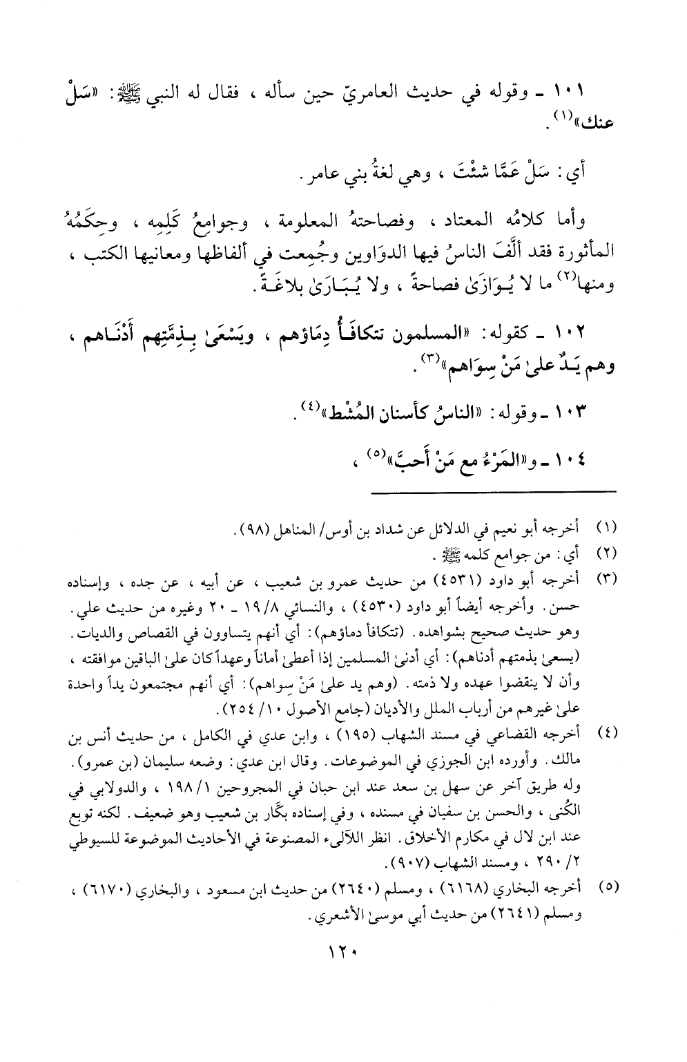 102 - كقوله: "المسلمون تتكافا دماؤهم، ويسعى بذمتهم أدناهم،
