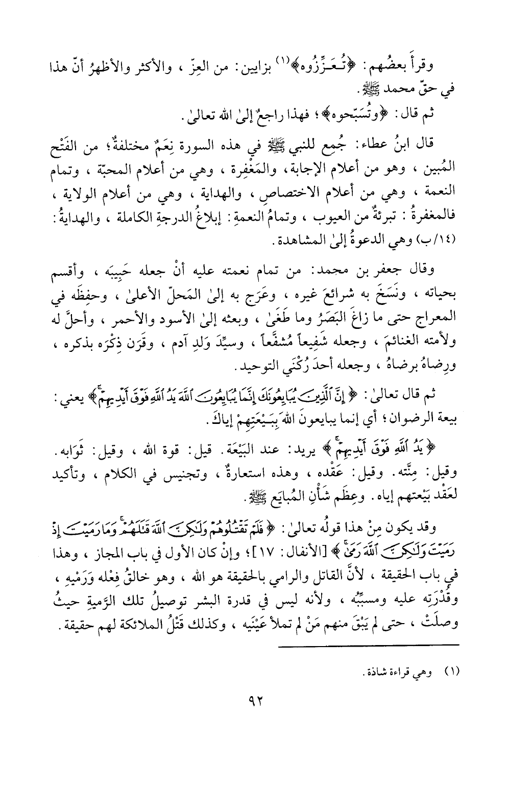 (يد الله فو! تى أيديهم) يريد: عند البيعة. قيل: قوة الله، وقيل: ثوابه.
