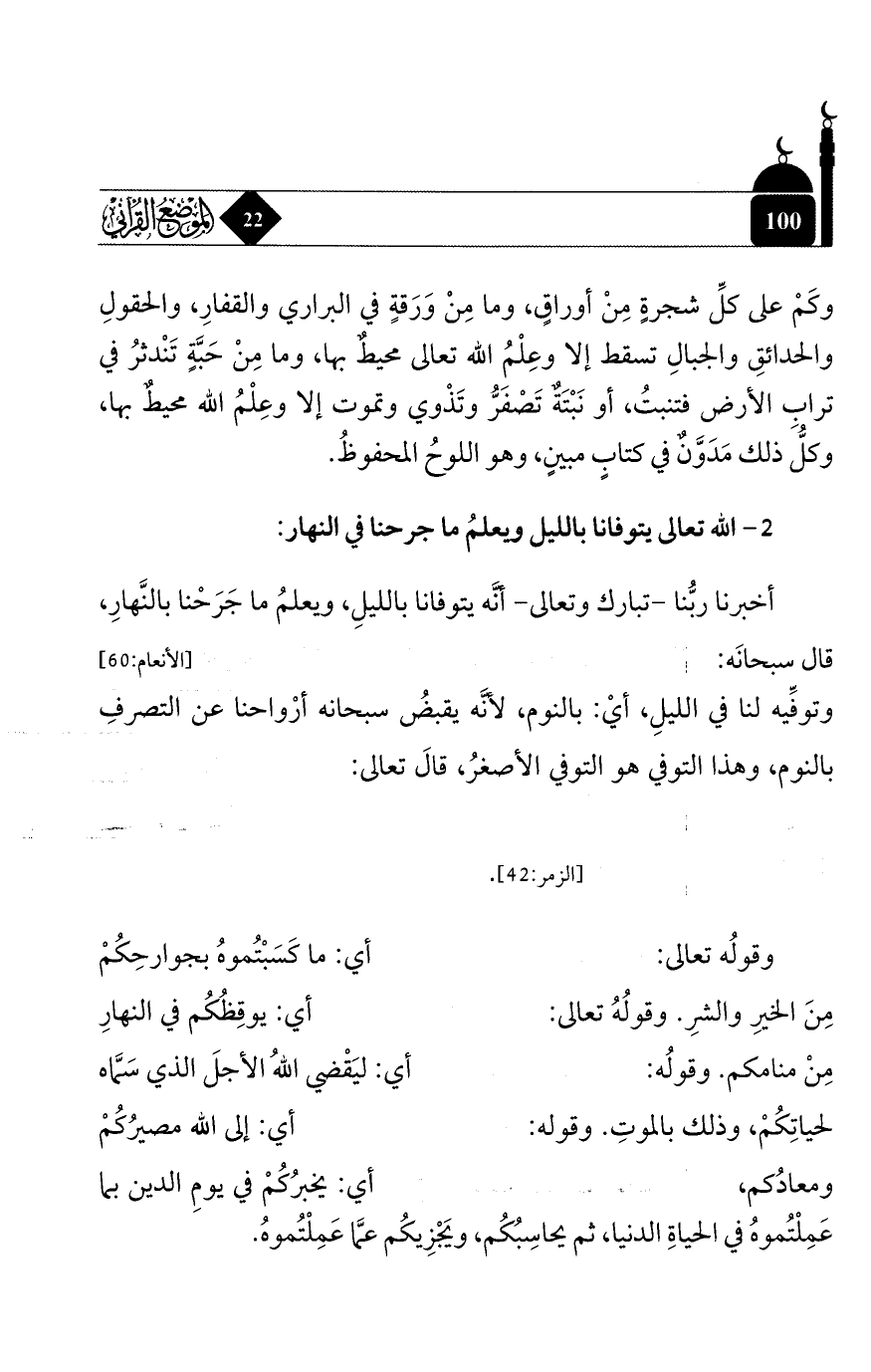 أخبرنا ربُّنا - تبارك وتعالى - أنَّه يتوفانا بالليل، ويعلم ما جرحنا بالنَّهار، قال سبحانه: {وَهُوَ الَّذِي يَتَوَفَّاكُمْ بِاللَّيْلِ وَيَعْلَمُ مَا جَرَحْتُمْ بِالنَّهَار} [الأنعام: 60] وتوفِّيه لنا في الليل، أي: بالنوم، لأنَّه يقبض سبحانه أرواحنا عن التصرف بالنوم، وهذا التوفي هو التوفي الأصغر، قال تعالى: {اللَّهُ يَتَوَفَّى الْأَنْفُسَ حِينَ مَوْتِهَا وَالَّتِي لَمْ تَمُتْ فِي مَنَامِهَا فَيُمْسِكُ الَّتِي قَضَى عَلَيْهَا الْمَوْتَ وَيُرْسِلُ الْأُخْرَى إِلَى أَجلَّ مُسَمًّى} [الزمر: 42].
