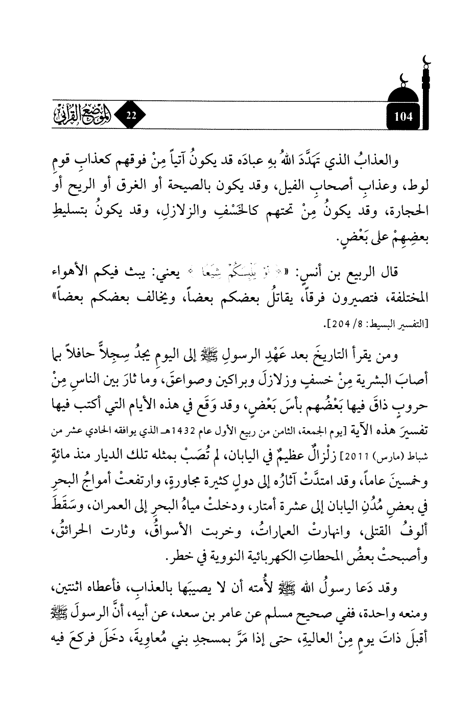 ومن يقرأ التاريخ بعد عهد الرسول - صلى الله عليه وسلم - إلى اليوم يجد سجلاً حافلاً بما أصاب البشرية من خسفٍ وزلازل وبراكين وصواعق، وما ثار بين الناس من حروبٍ ذاق فيها بعضهم بأس بعضٍ، وقد وقع في هذه الأيام التي أكتب فيها تفسير هذه الآية [يوم الجمعة، الثامن من ربيع الأول عام 1432 هـ الذي يوافقه الحادي عشر من شباط (مارس) 2011] زلزالٌ عظيم في اليابان، لم تصب بمثله تلك الديار منذ مائة وخمسين عاماً، وقد امتدَّت آثاره إلى دول كثيرة مجاورةٍ، وارتفعت أمواج البحر في بعض مدن اليابان إلى عشرة أمتار، ودخلت مياه البحر إلى العمران، وسقط ألوف القتلى، وانهارت العمارات، وخربت الأسواق، وثارت الحرائق، وأصبحت بعض المحطات الكهربائية النووية في خطر.