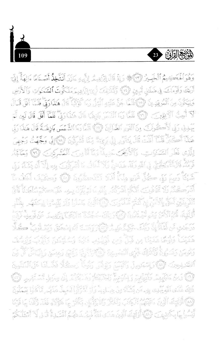 وَهُوَ الْحَكِيمُ الْخَبِيرُ * وَإِذْ قَالَ إِبْرَاهِيمُ لِأَبِيهِ آزَرَ أَتَتَّخِذُ أَصْنَامًا آلِهَةً إِنِّي أَرَاكَ وَقَوْمَكَ فِي ضَلَالٍ مُبِينٍ * وَكَذَلِكَ نُرِي إِبْرَاهِيمَ مَلَكُوتَ السَّمَاوَاتِ وَالْأَرْضِ وَلِيَكُونَ مِنَ الْمُوقِنِينَ * فَلَمَّا جَنَّ عَلَيْهِ اللَّيْلُ رَأَى كَوْكَبًا قَالَ هَذَا رَبِّي فَلَمَّا أَفَلَ قَالَ لَا أُحِبُّ الْآفِلِينَ * فَلَمَّا رَأَى الْقَمَرَ بَازِغًا قَالَ هَذَا رَبِّي فَلَمَّا أَفَلَ قَالَ لَئِنْ لَمْ يَهْدِنِي رَبِّي لَأَكُونَنَّ مِنَ الْقَوْمِ الضَّالِّينَ * فَلَمَّا رَأَى الشَّمْسَ بَازِغَةً قَالَ هَذَا رَبِّي هَذَا أَكْبَرُ فَلَمَّا أَفَلَتْ قَالَ يَا قَوْم إِنِّي بَرِيءٌ مِمَّا تُشْرِكُونَ * إِنِّي وَجَّهْتُ وَجْهِيَ لِلَّذِي فَطَرَ السَّمَاوَاتِ وَالْأَرْضَ حَنِيفًا وَمَا أَنَا مِنَ الْمُشْرِكِينَ * وَحَاجَّهُ قَوْمُهُ قَالَ أَتُحَاجُّونِّي فِي اللَّهِ وَقَدْ هَدَانِي وَلَا أَخَافُ مَا تُشْرِكُونَ بِهِ إِلَّا أَنْ يَشَاءَ رَبِّي شَيْئًا وَسِعَ رَبِّي كُلَّ شَيْءٍ عِلْمًا أَفَلَا تَتَذَكَّرُونَ * وَكَيْفَ أَخَافُ مَا أَشْرَكْتُمْ وَلَا تَخَافُونَ أَنَّكُمْ أَشْرَكْتُمْ بِاللَّهِ مَا لَمْ يُنَزِّلْ بِهِ عَلَيْكُمْ سُلْطَانًا فَأَيُّ الْفَرِيقَيْنِ أَحَقُّ بِالْأَمْنِ إِنْ كُنْتُمْ تَعْلَمُونَ * الَّذِينَ آمَنُوا وَلَمْ يَلْبِسُوا إِيمَانَهُمْ بِظُلْمٍ أُولَئِكَ لَهُمُ الْأَمْنُ وَهُمْ مُهْتَدُونَ * وَتِلْكَ حُجَّتُنَا آتَيْنَاهَا إِبْرَاهِيمَ عَلَى قَوْمِهِ نَرْفَعُ دَرَجَاتٍ مَنْ نَشَاءُ إِنَّ رَبَّكَ حَكِيمٌ عَلِيمٌ * وَوَهَبْنَا لَهُ